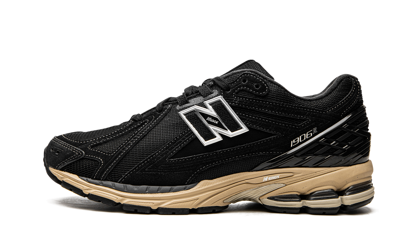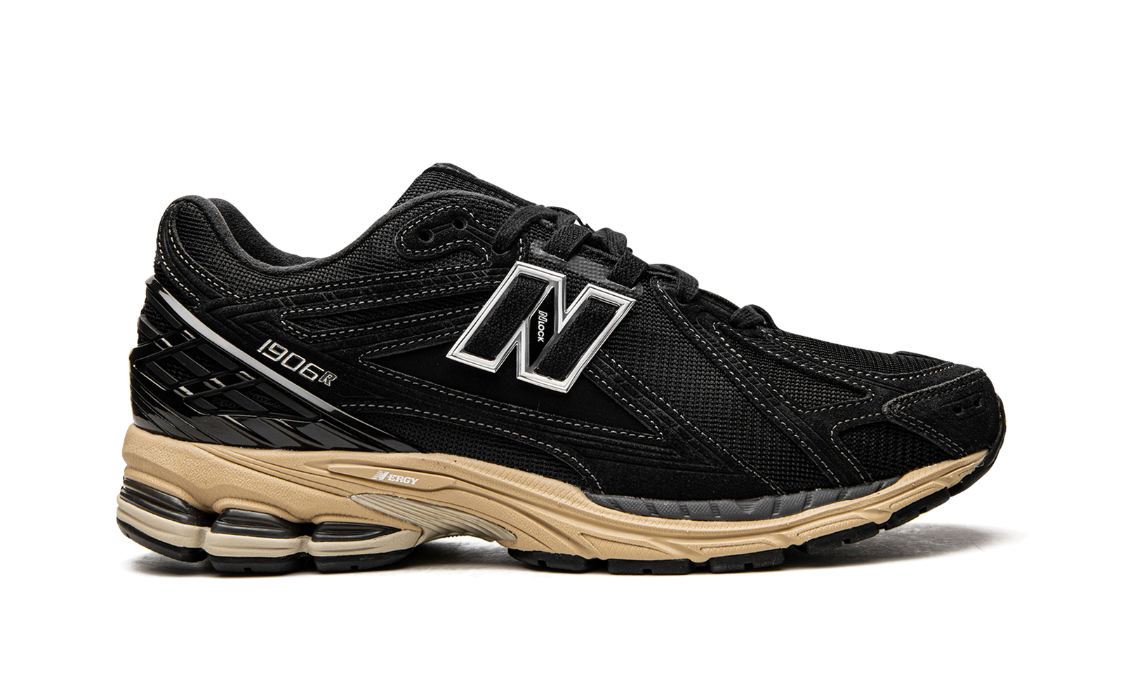 The New Balance 1906R “Black/Cream” is a mostly monochromatic black colorway of the lifestyle shoe with a retro-modern appearance. Inspired by 2000s-era performance running sneakers, the New Balance 1906 has both a throwback and contemporary design that lends it to casual wear. The shoe features a black mesh base while tonal suede overlays appear on the forefoot, mid-panel, and heel counter. A black “N” logo can be found on both sides of the shoe. The shoe rides on a lightweight pre-aged, cream-colored N-ergy foam cushioned midsole.
