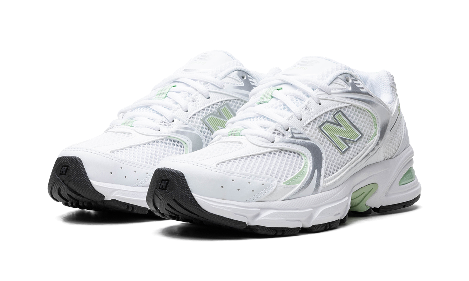 The New Balance 530 “Mint Green” is a colorway of the retro performance shoe with mint green features. The New Balance 530 was first released in 1992 by the Boston footwear company, and then it was reissued as part of the Y2K sneaker trend. The “Mint Green” features a white mesh base with a combination of silver synthetic and white leather overlays. A textured Mint Green “N” logo appears on both sides and a small Mint Green “530” detail is seen on the lateral side of the heel. Old school “New Balance” branding is found on the tongue. The chunky, white foam midsole features New Balance’s signature ABZORB cushioning for all-day comfort.