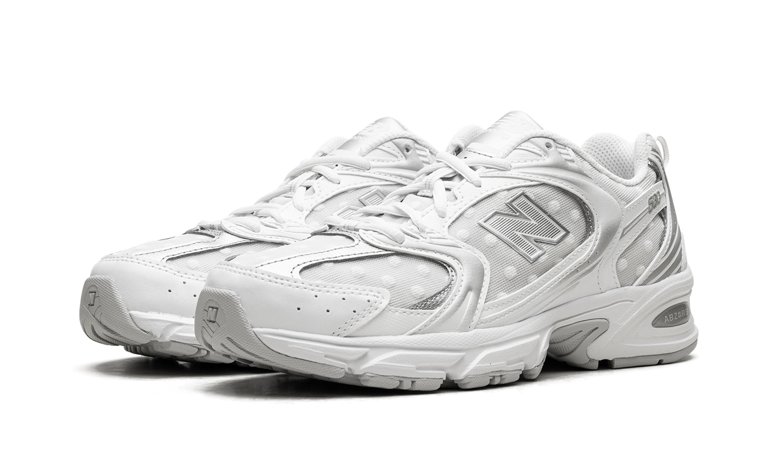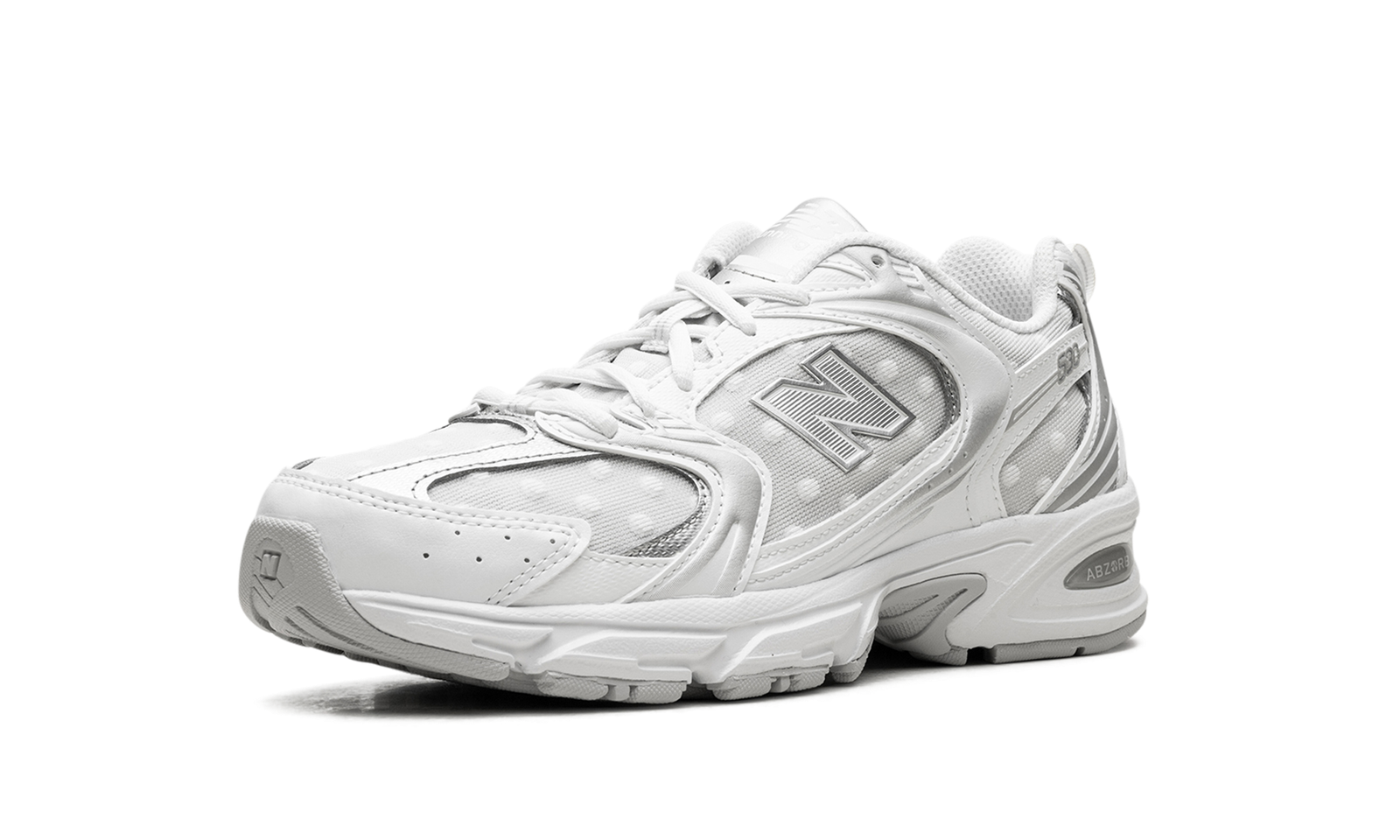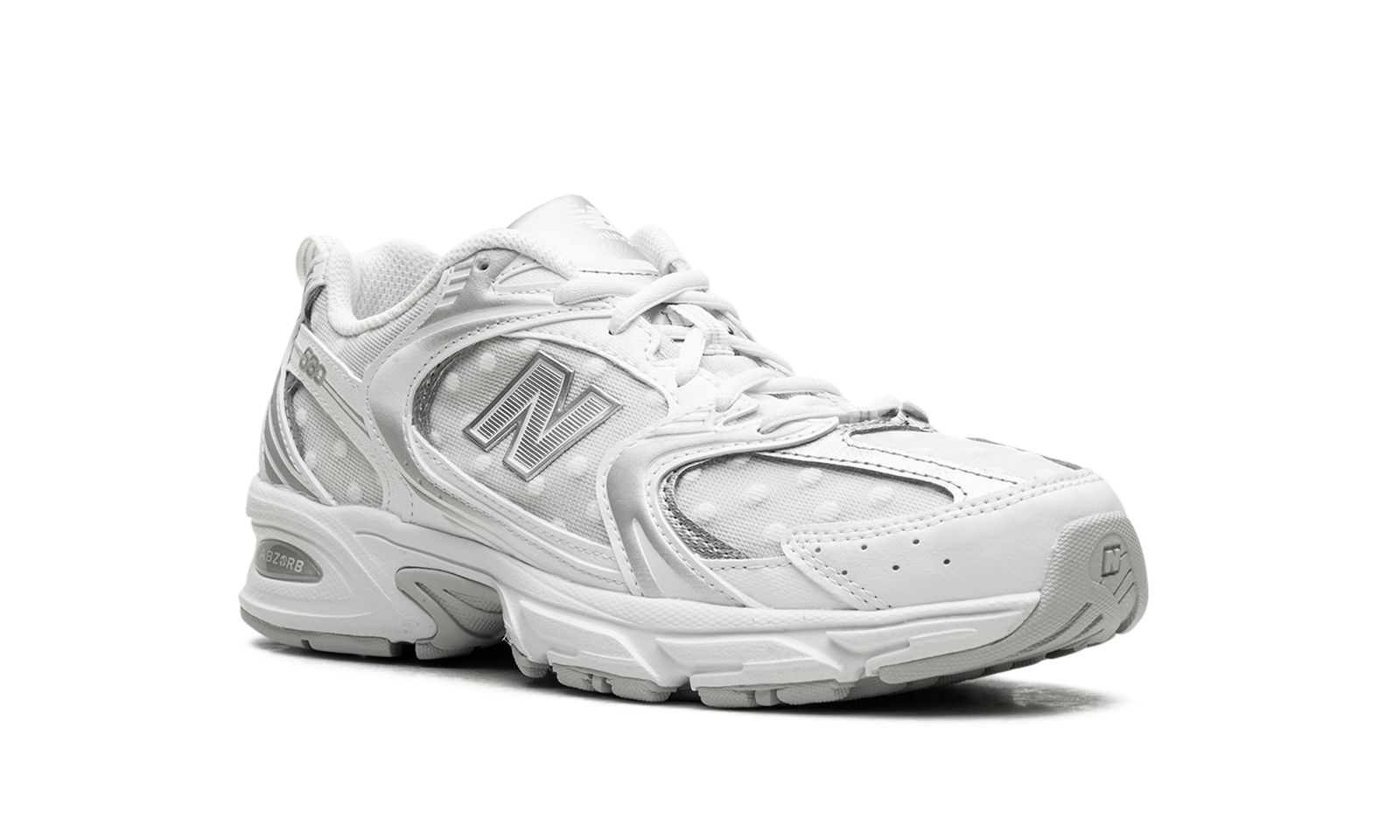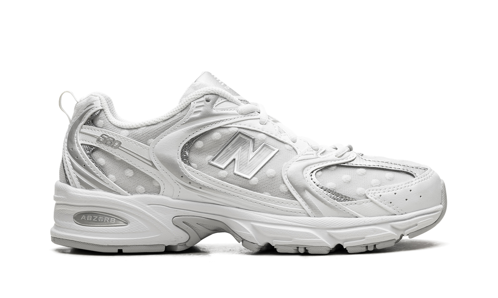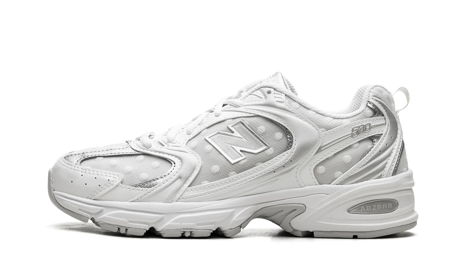 Step out in a fresh take on a classic with the New Balance 530, also known as the “Silver Metallic Polka Dots.” These sneakers offer a stylish blend of retro inspiration and modern flair. The clean white base is accented with eye-catching silver metallic detailing, creating a look that’s both timeless and on-trend. Experience all-day comfort with the cushioned design and breathable materials. Add a touch of sparkle to your everyday style with these versatile and iconic sneakers.