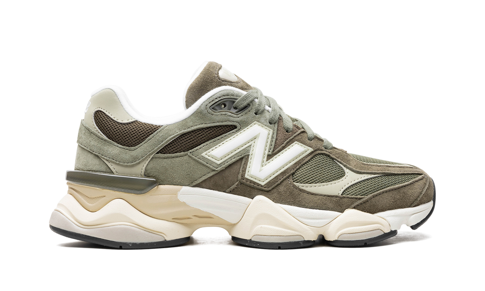 The New Balance 9060 “Dark Army” is an olive-based colorway of the shoe with a retro-yet-contemporary design. The New Balance 9060 has a chunky rubber sole that gives the shoe both a retro and modern look. On the “Dark Army” colorway, the shoe features light and dark olive green hues. The olive green mesh base is paired with Dark Army and Dark Olive leather and suede overlays. An oversized cream “N” with olive accenting appears on the mid-panel. As mentioned, the shoe is mounted on an oversized, dual-density midsole featuring ABZORB and SBS cushioning.