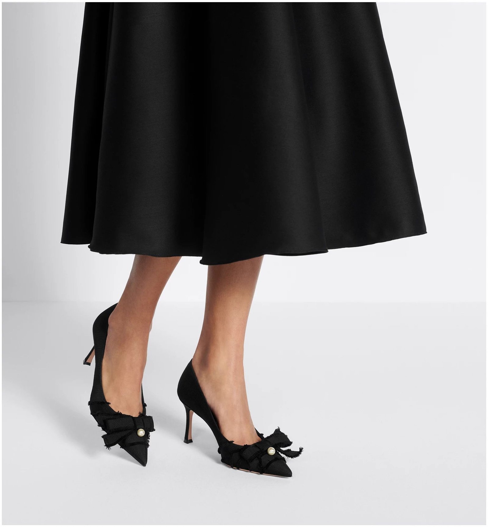 The Adiorable pump is modern and elegant. The black fringed grosgrain upper showcases an unstructured bow on the front embellished with a CD signature white resin pearl. Completed by a 10-cm (4-inch) heel and pointed toe, the shoe will lend a refined touch to any of the season’s looks.