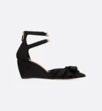 New for Cruise 2025, the Adiorable pump is modern and elegant. The black fringed grosgrain upper features a deconstructed bow on the front embellished with a white resin pearl with the CD signature, inspired by the iconic Dior Tribales earrings. Completed by a 6.5-cm (2.5-inch) wedge heel, pointed toe and ankle straps, the shoe will lend a refined touch to any of the season’s looks.