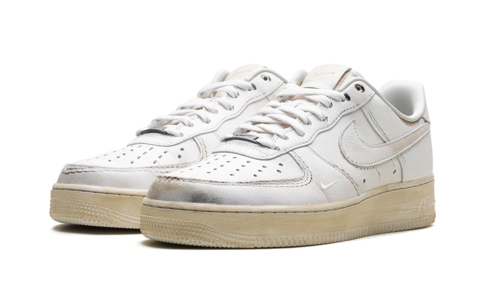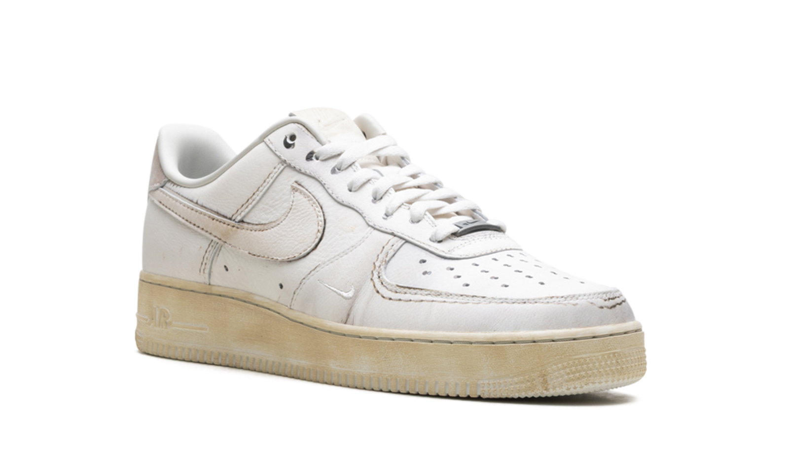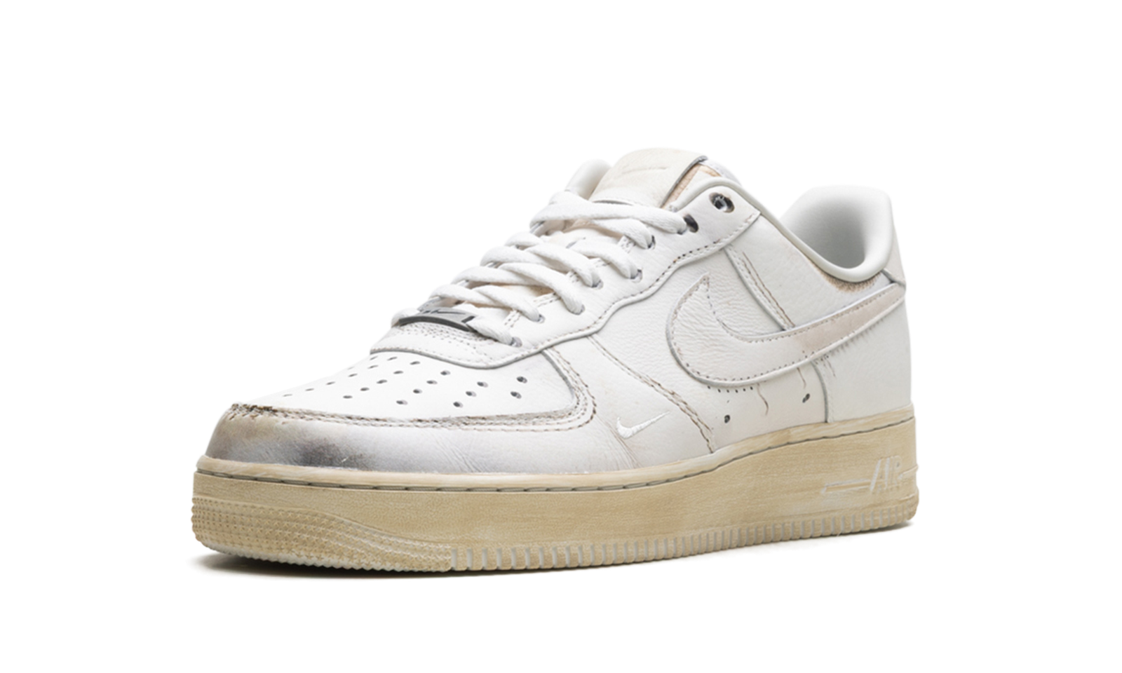 The Nike Air Force 1 Low .SWOOSH ‘Dirty Triple White’ flips the iconic fresh white aesthetic on its head, arriving pre-worn and “dirty” straight out of the box. This conceptual sneaker, part of the exclusive .SWOOSH line, is a commentary on the life cycle of the classic AF1.