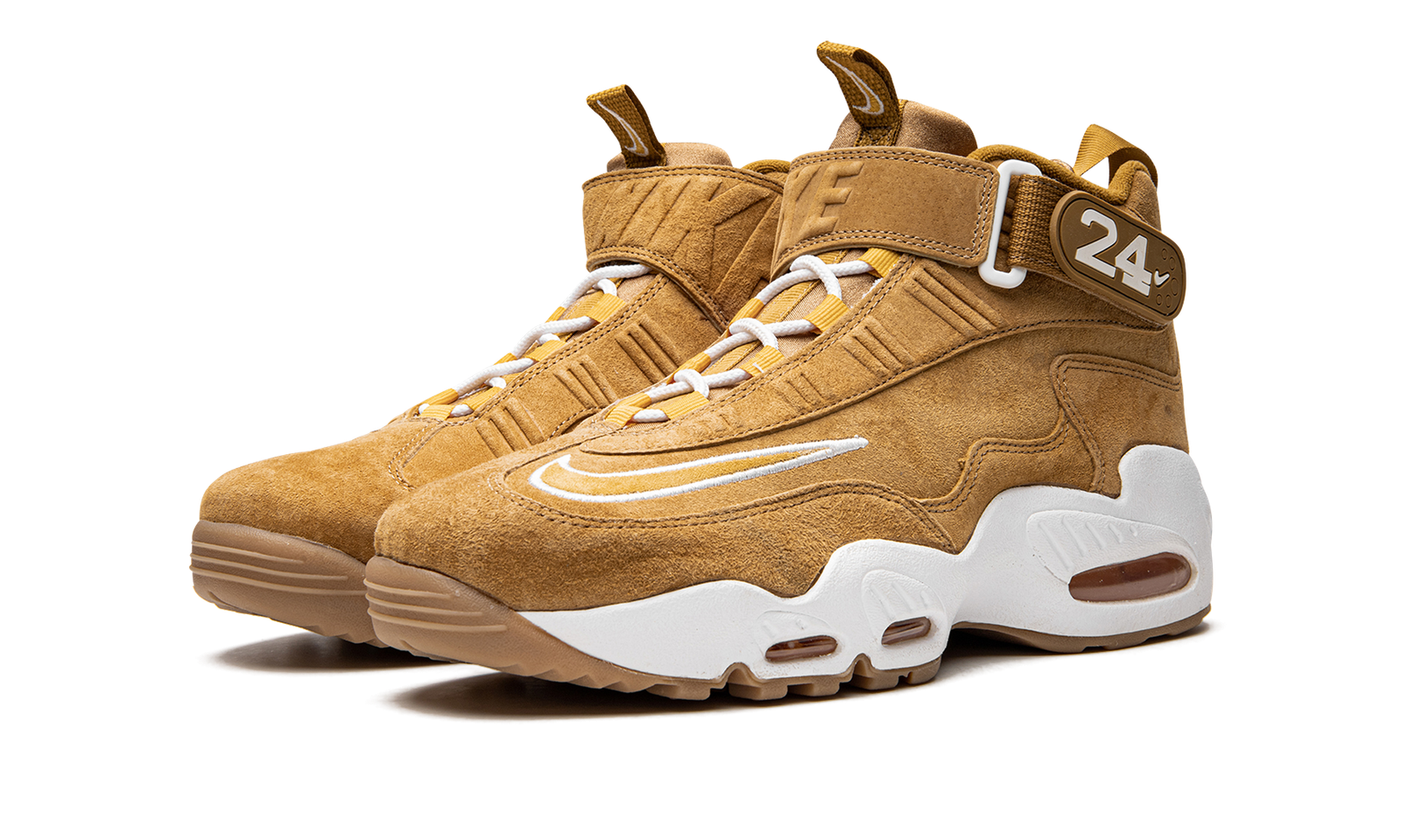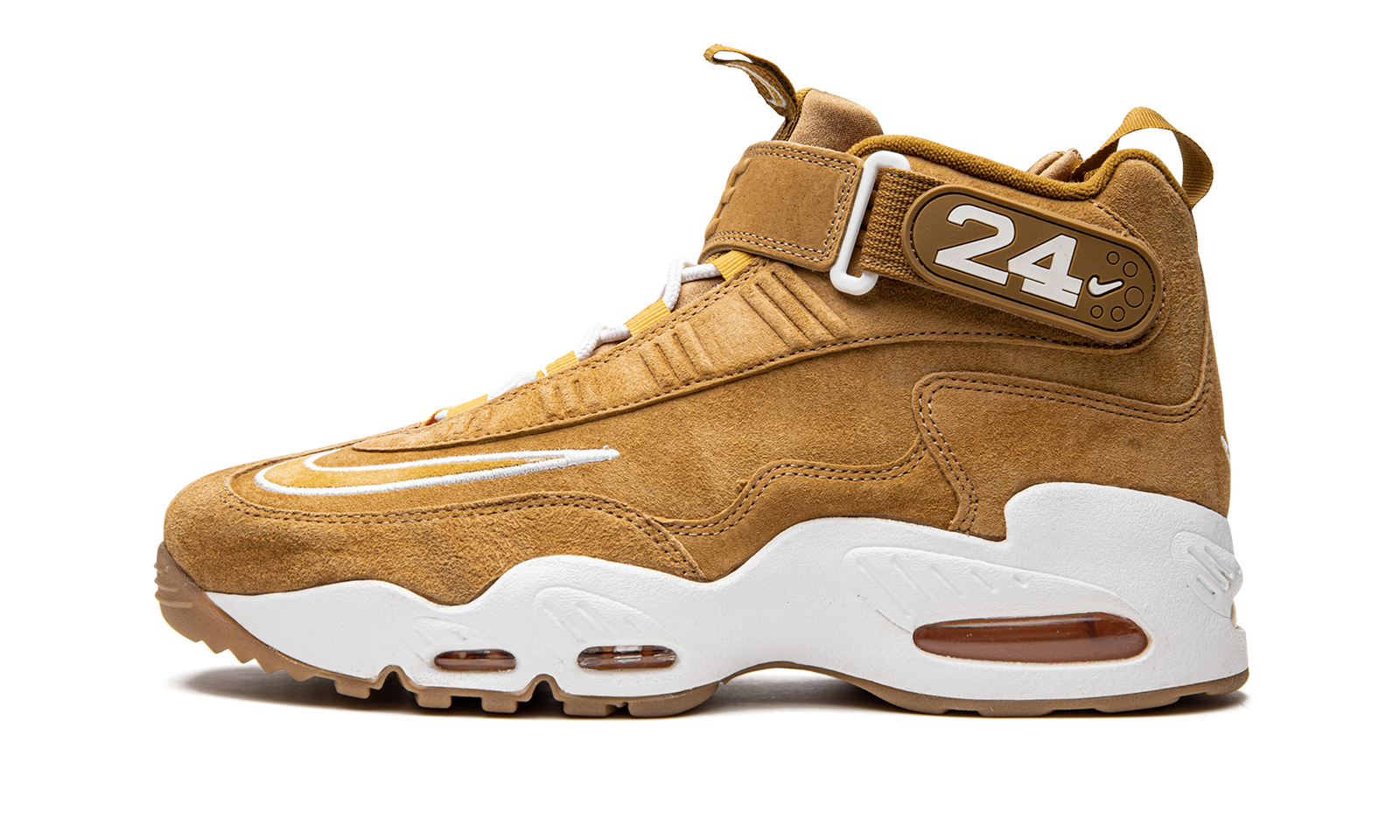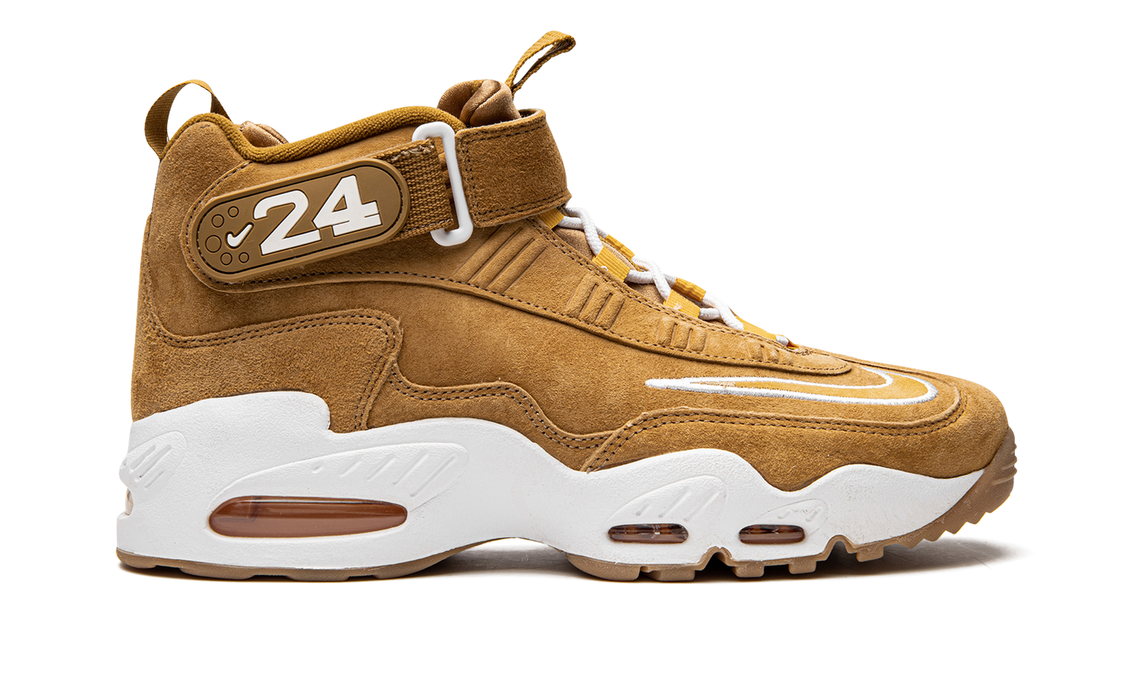 The Nike Air Griffey Max “Wheat” is an autumn-inspired colorway of Ken Griffey Jr.’s former signature shoe. Nike’s beloved “Wheat” theme has appeared on countless releases over the years, and it finds its way on the Air Griffey Max a year after the retro performance shoe celebrated its 25th anniversary. This release features a Wheat-colored suede upper with a contrasting white outline Swoosh on the forefoot. Griffey’s “24” jersey number with the Seattle Mariners appears on the side of the adjustable ankle strap and tonal “Nike” branding is debossed on the front of the strap.