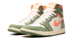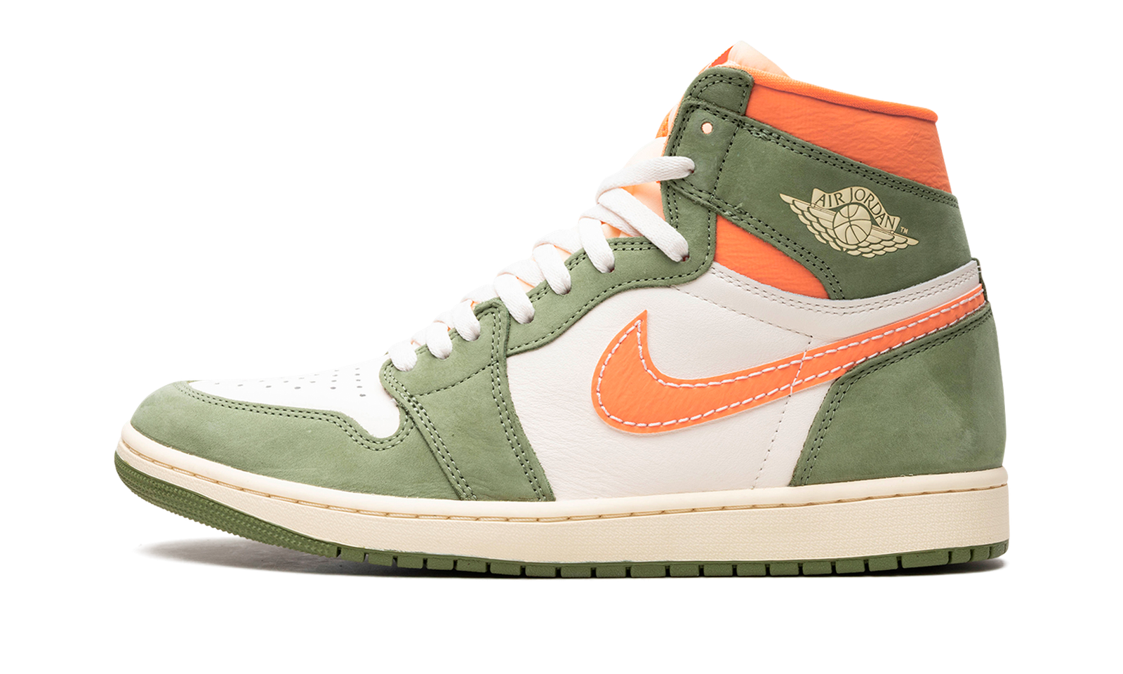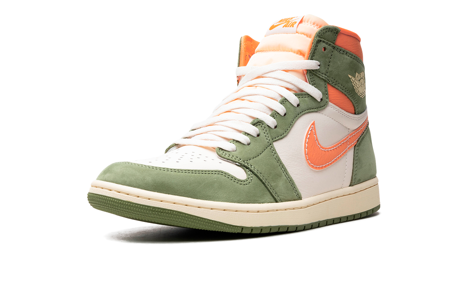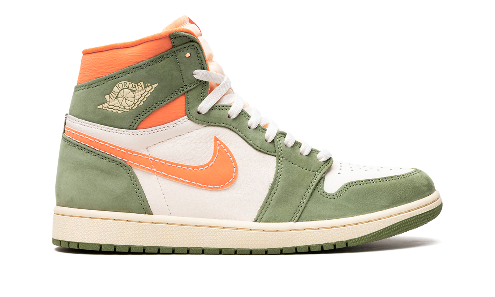 The Air Jordan 1 High OG Craft “Celadon” is a colorway of the classic shoe made with a premium combination of materials that give it a refined, lifestyle-focused design. From a collection of “Craft” sneakers, the Jordan 1 High OG Craft in “Celadon” features a white leather base with olive green suede overlays on the toe, forefoot, eyelets, collar, and heel. A Bright Mandarin leather Swoosh can be seen on either side of the shoe. The fiery orange tone also appears on the padded collar and inner lining. A cream “Wings” logo can be found on the collar and “Nike Air” detailing appears on the tongue tag. An aged finish is applied to the midsole, giving the shoe a vintage look. Release date: December 23, 2023
