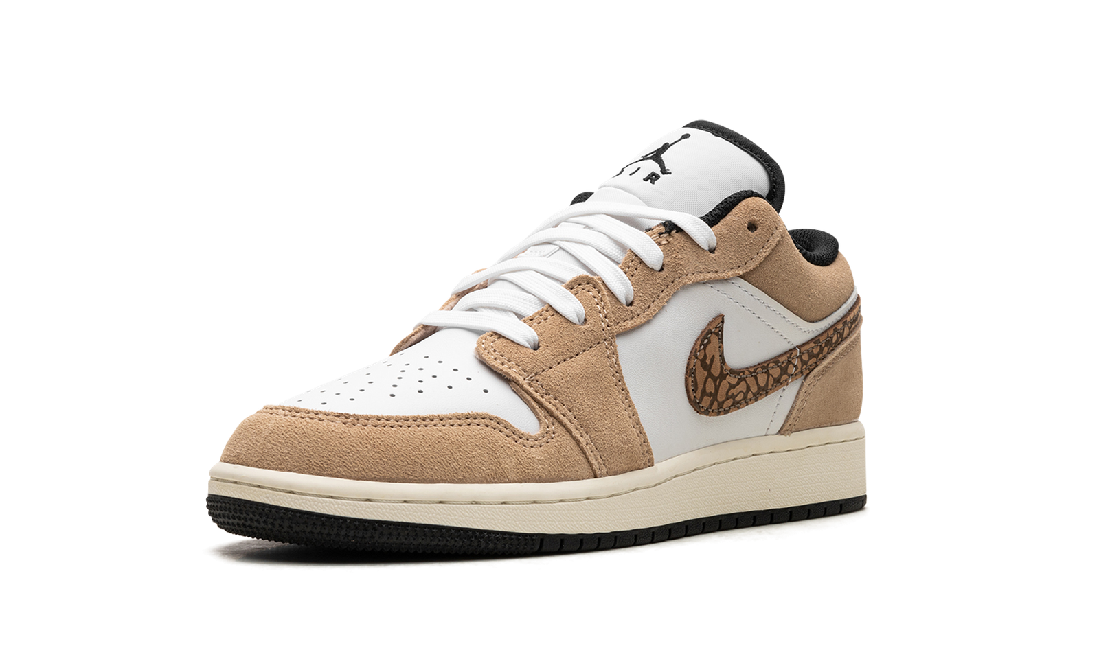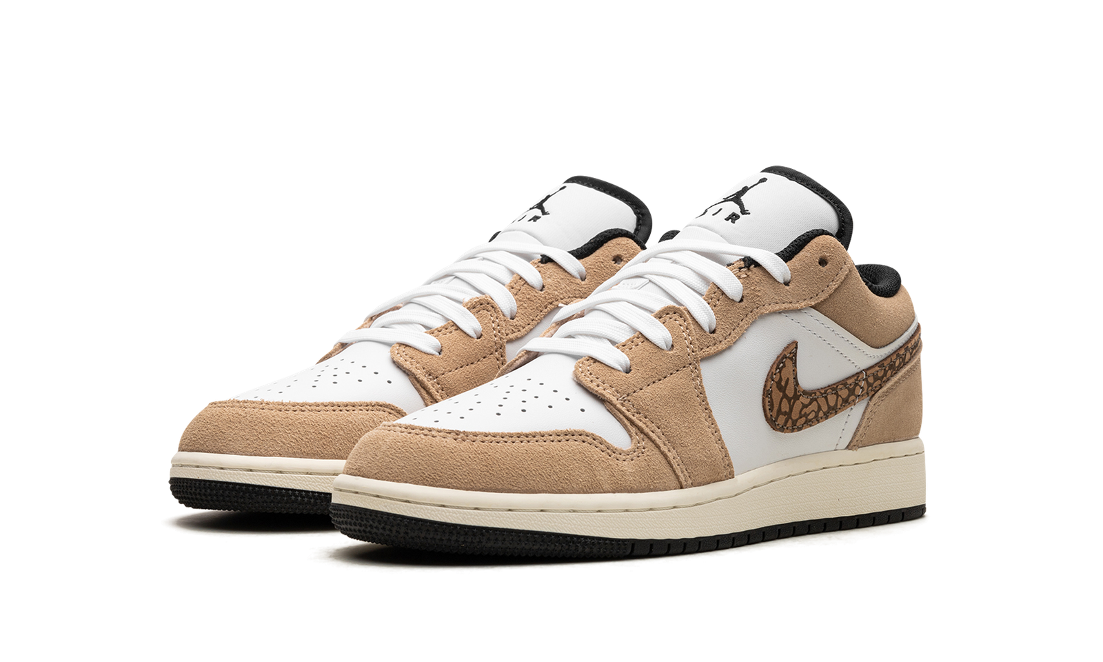The Air Jordan 1 Low SE GS “Brown Elephant” is the youth sizing of the colorway of the retro basketball shoe with elephant print on its design. The colorway features a white leather base with tan suede overlays. The Swoosh on the sides has been designed in brown elephant print, a classic pattern that first appeared on the Air Jordan 3 way back in 1988. As for the rest of the shoe, a “Wings” logo is embroidered on the heel and a Jumpman is seen on the tongue. An aged midsole and brown rubber outsole complete the look. Release date: July 20, 2023