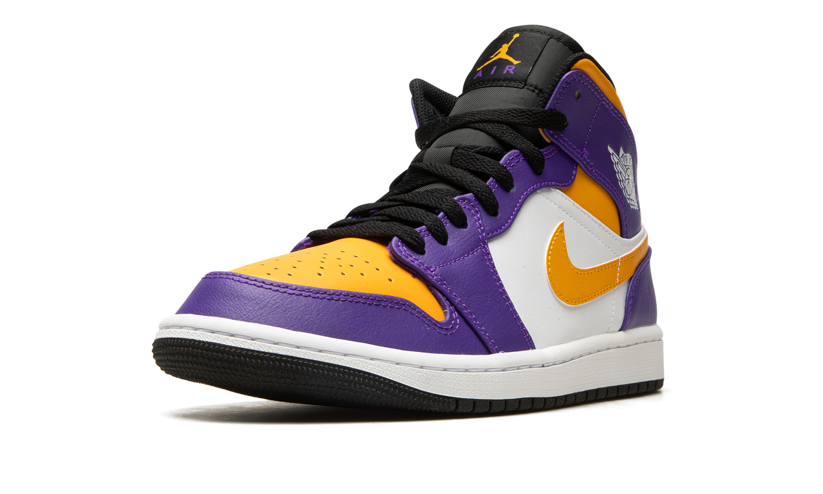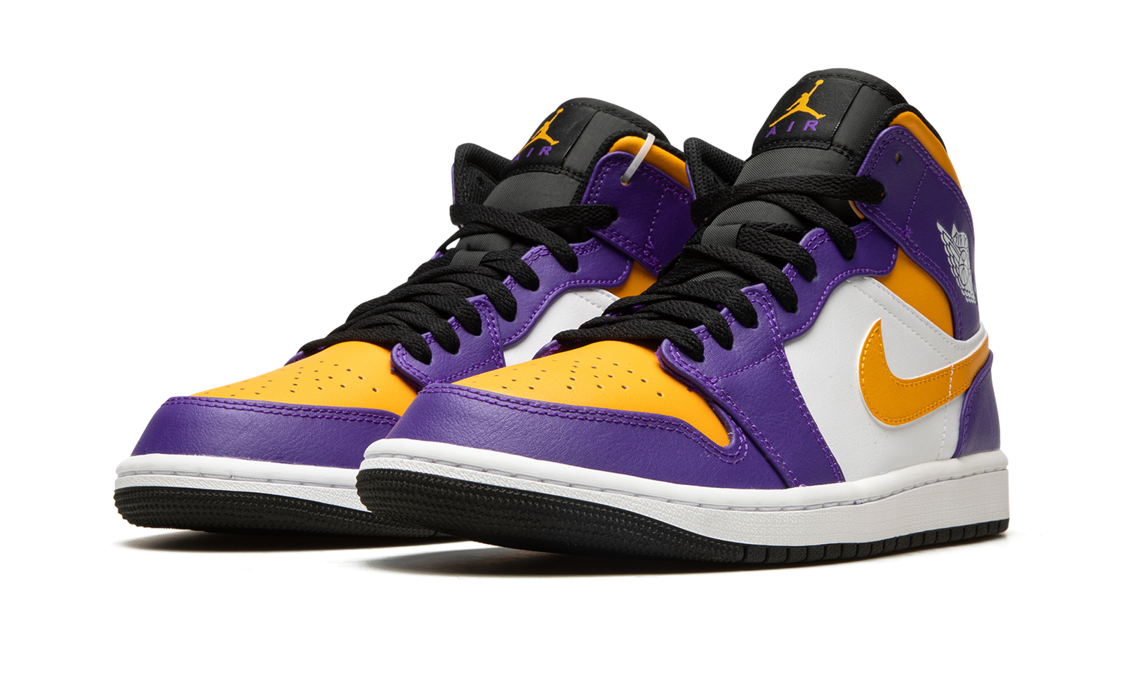 The Air Jordan 1 Mid “Lakers” is a colorway of the lifestyle shoe that features the team uniform colors of the Los Angeles Lakers on its design. The Jordan 1 Mid is not officially affiliated with the Lakers in any way, although it does draw favorably from the basketball team’s uniform colors. Yellow leather appears on the perforated toe and collar while contrasting purple leather is found on the overlays. A yellow leather Swoosh appears on either side of the shoe and a white “Wings” logo can be found on the collar. Yellow Jumpman branding is paired with purple “Air” detailing on the tongue tag of the black nylon tongue. A white midsole and black rubber outsole complete the look. Release date: September 17, 2022