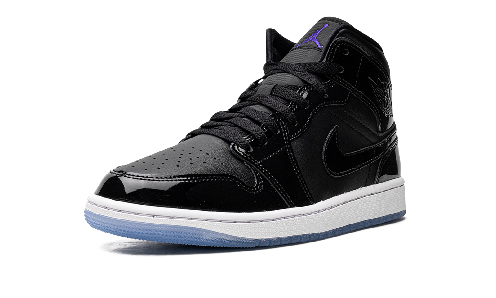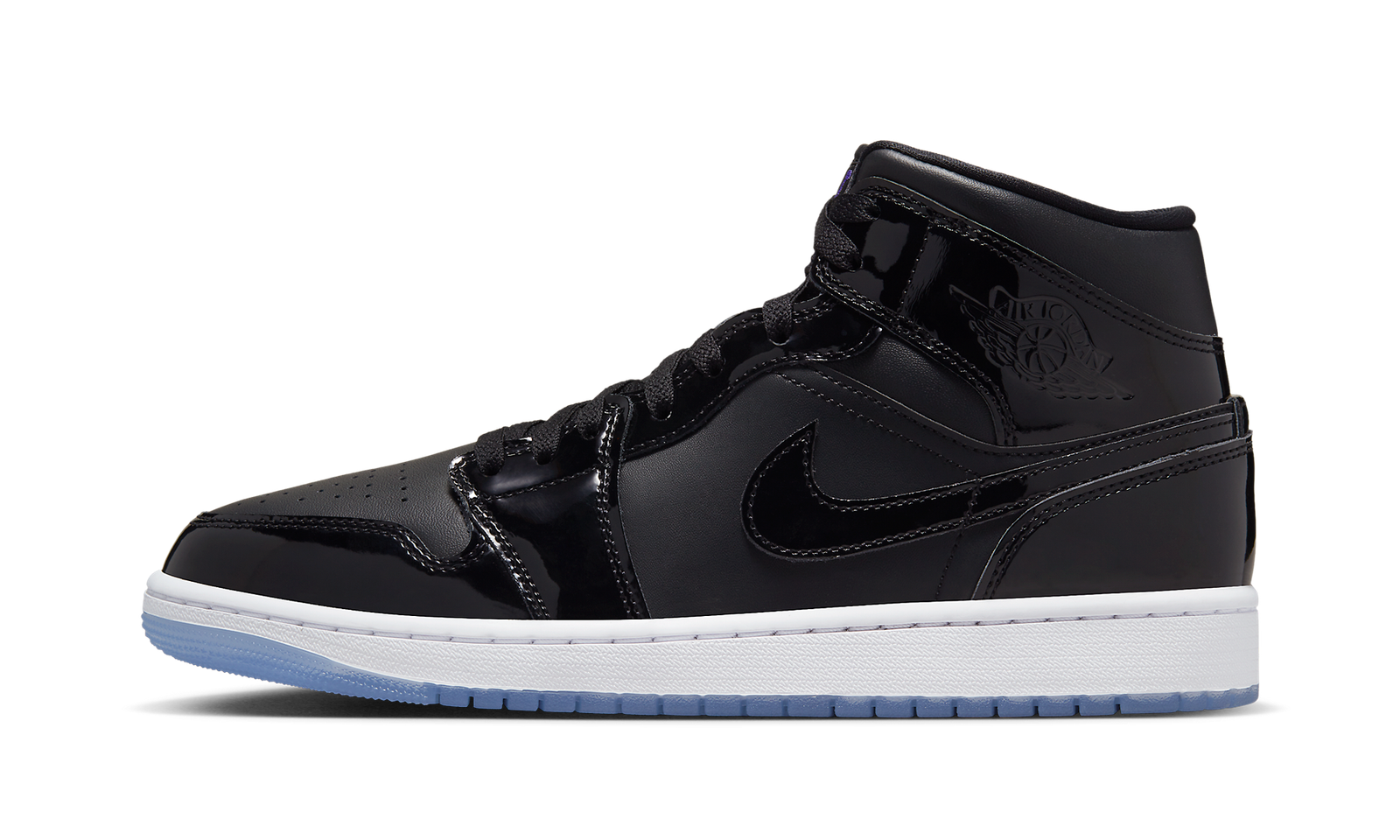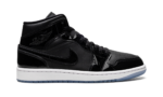 The Air Jordan 1 Mid SE “Space Jam” is a head-turning colorway of the popular lifestyle shoe that is inspired by a classic Air Jordan design. The design we’re referring to is the Air Jordan 11’s “Space Jam” colorway that was worn by Michael Jordan in the movie of the same name. The Jordan 1 Mid “Space Jam” draws favorably from the Jordan 11 in that it is constructed with black patent leather on its design, here on its overlay panels and on the “Wings” branding on the collar and the Swoosh branding found on either side. The shoe’s base is designed in tonal black leather. A white rubber midsole and icy blue translucent rubber outsole completes the “Space Jam” theme.