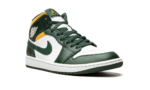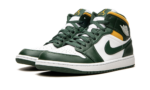 The Air Jordan 1 Mid “Sonics” is a colorway of Michael Jordan’s first signature shoe in the mid-top silhouette that features the former team uniform colors of the Seattle Supersonics. The now-defunct Sonics, who relocated to become the Oklahoma City Thunder in the late 2000s, wore green-and-yellow team uniforms and were among the most popular basketball teams in the NBA back in the day. The “Sonics” Jordan 1 Mid unofficially honors the team with Noble Green leather overlays against a white leather base. A green leather Swoosh resides on either side of the shoe. A white “Wings” logo is found on the collar and white Jumpman and “Air” detailing appears on the green leather tongue tag. A Pollen-colored collar adds to the Sonic-inspired look.