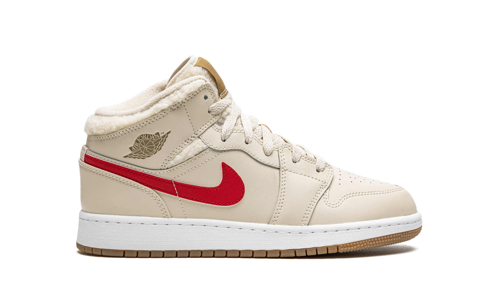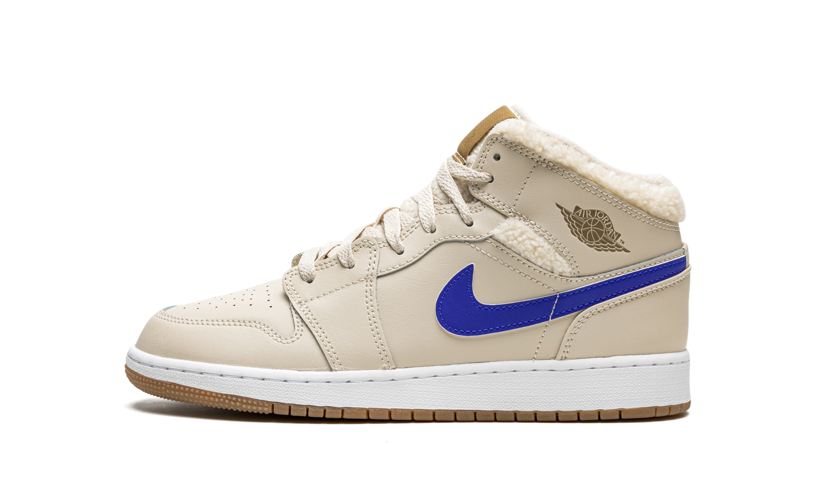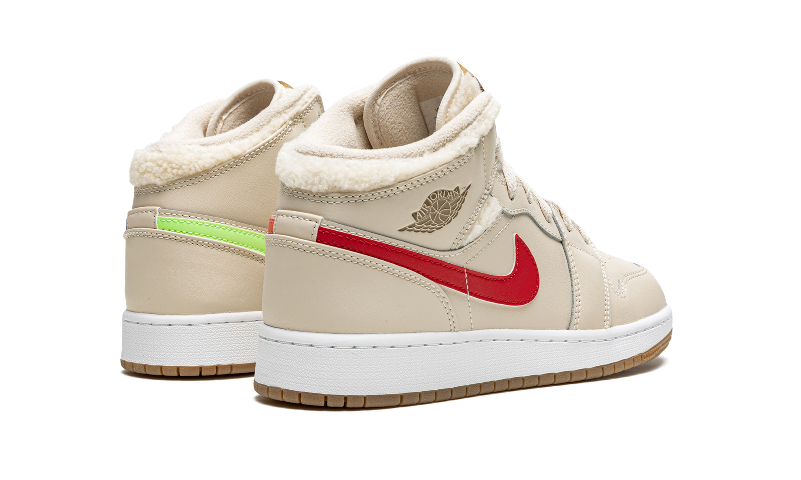 The Air Jordan 1 Mid Utility GS “Fleece” is a kids version of Michael Jordan’s first signature shoe in a construction designed for the cold weather months. Dubbed the “Fleece,” the neutral-based look for the popular mid-top Air Jordan 1 features a fleece inner lining construction that is both comfortable and warm. The upper is designed in beige or Pearl White-colored leather, including the perforated toe, mid-panel, collar, and heel. Mismatching leather Swooshes in blue, neon green, red, and orange appear on both the left and right shoe, respectively. A tonal “Wings” logo appears on the collar. The sherpa-like fleece material is found on the collar and tongue. Additional details include a natural or brown tongue tag with Jumpman branding, a white midsole, and gum rubber outsole.