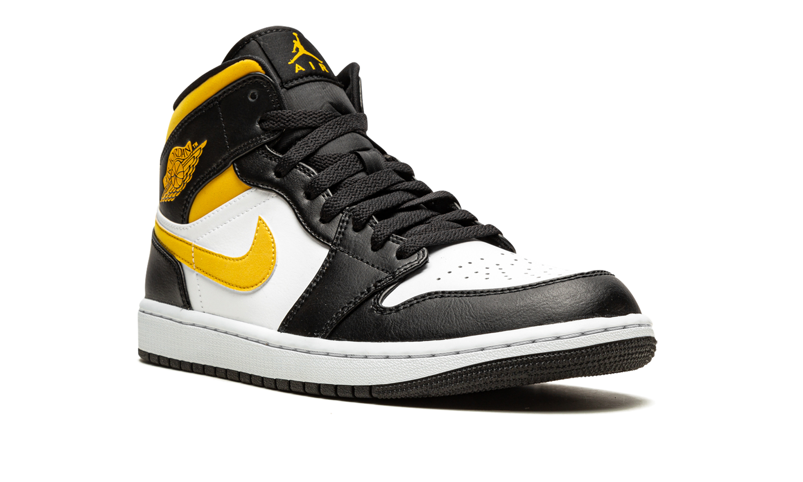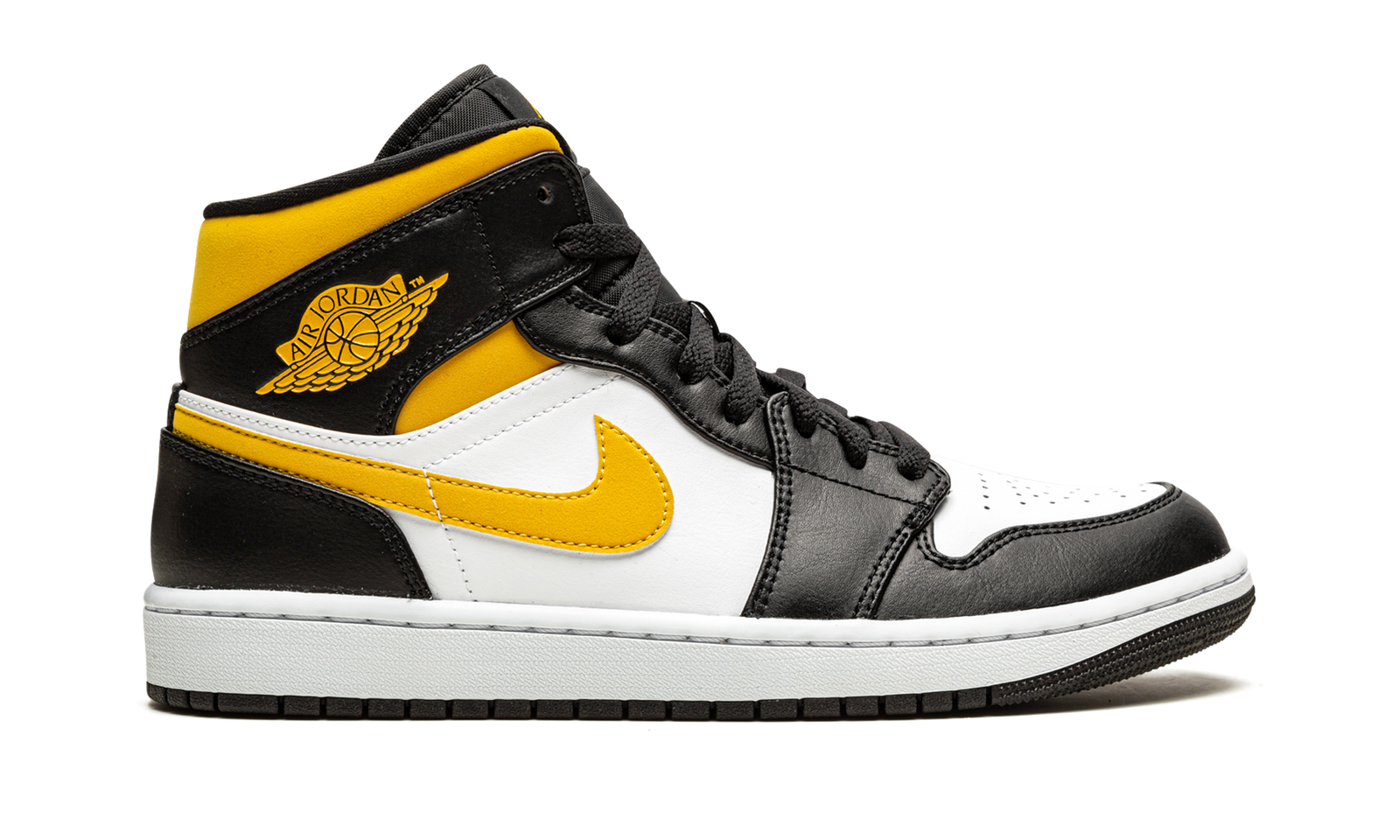 The Air Jordan 1 Mid “White/Pollen/Black” is a clean look for the mid-top version of the retro basketball shoe. In “White/Pollen/Black,” the Jordan 1 Mid arrived in 2021 in yet another wearable colorway. The perforated toe and mid-panel display a white leather construction. Contrasting black leather can be found on the various overlays on the upper, including on the Swoosh logo. A University Gold “Wings” logo appears on the black leather overlay on the yellow leather collar. Additional University Gold accenting comes into play on the Jumpman and “Air” branding on the tongue tag.