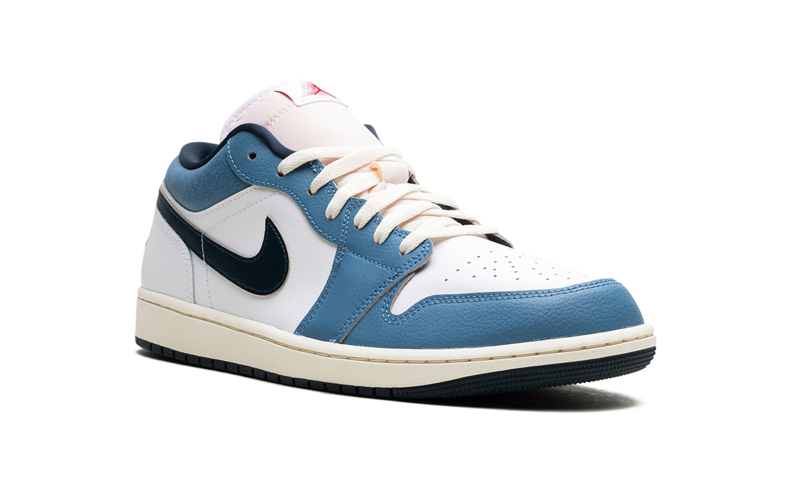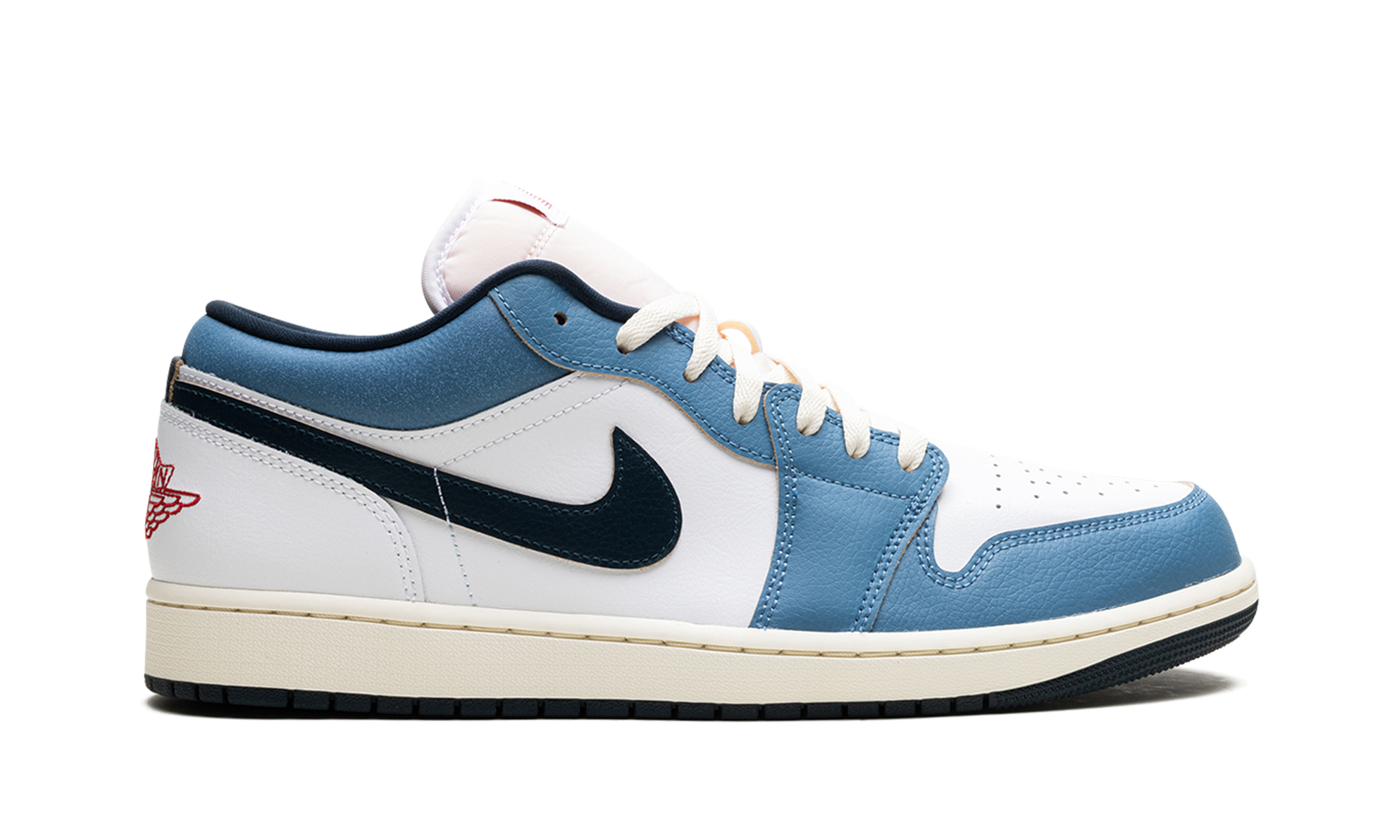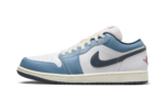 The Air Jordan 1 Low “Motion” is a colorway of the retro basketball shoe inspired by its iconic branding. The “Motion” Jordan 1 Low refers to the Air Jordan 1’s signature Jumpman logo on the tongue, and how it appears to be flying through the air en route to a slam dunk. The upper features a White leather construction with Aegean Storm leather overlays on the toe, forefoot, and eyelets. The Swoosh branding on the sides swap between Armory Navy and red on the lateral and medial sides, respectively. A red “Wings” logo is embroidered on the heel, while a motion Jumpman logo can be found on the tongue. A Pale Ivory midsole completes the look. Release date: June 14, 2024