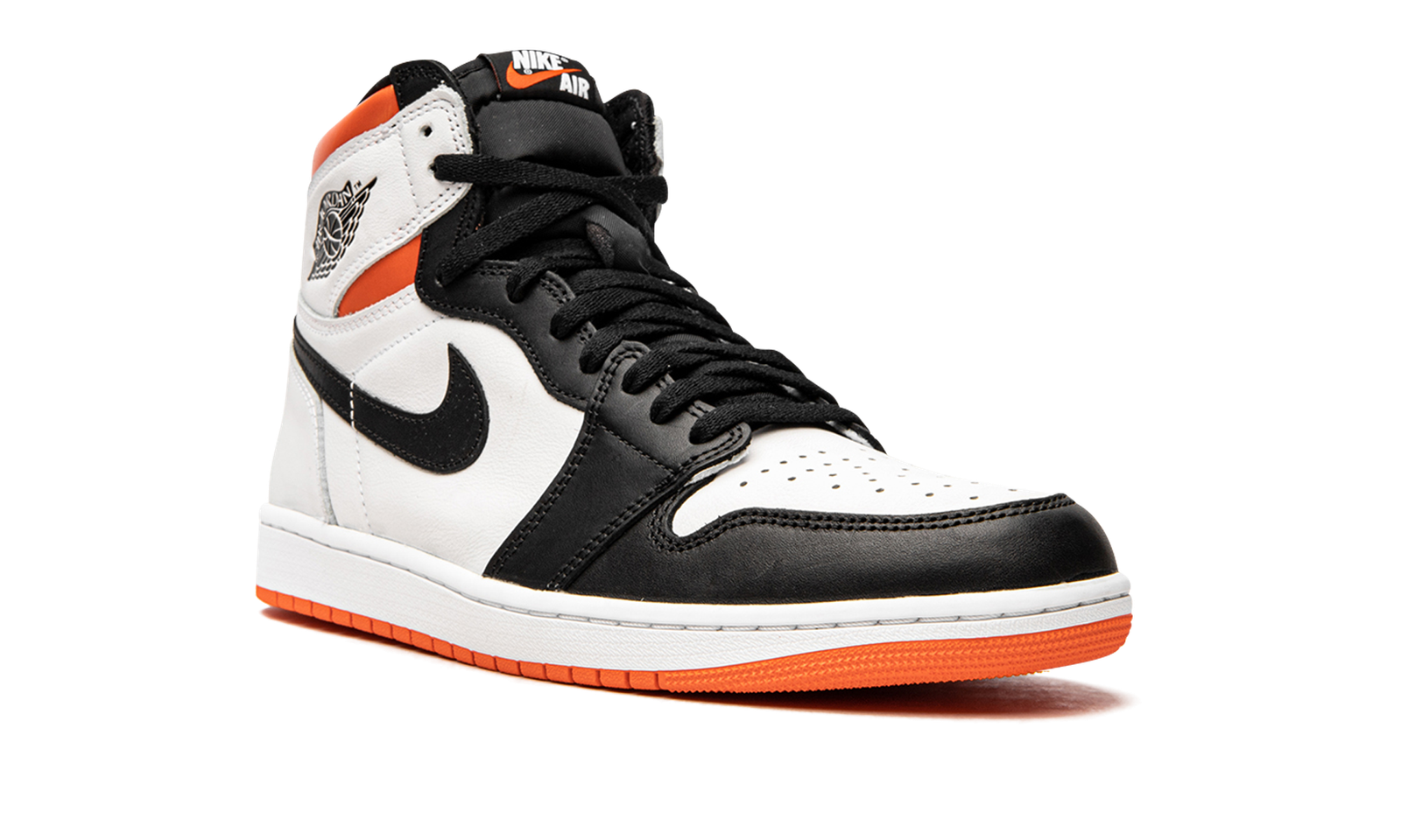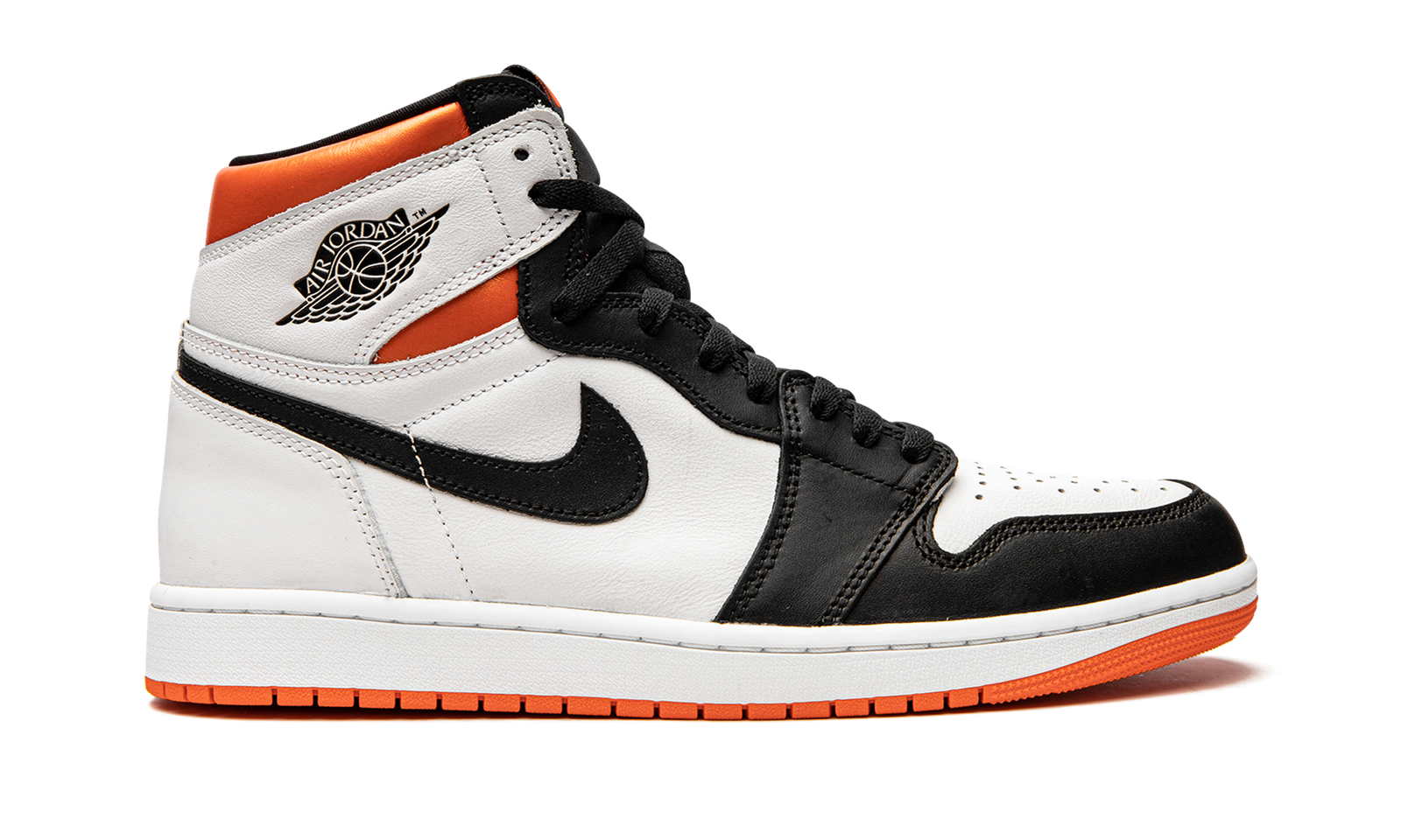 The Air Jordan 1 High OG “Electro Orange” is another clean look for Michael Jordan’s first signature shoe that utilizes orange accenting in its design. A July 2021 release by Jordan Brand, the “Electro Orange” edition has a color block reminiscent of an original Air Jordan 1 colorway: the “Black Toe.” It should also call to mind the beloved “Shattered Backboard” series thanks to the orange, black, and white color scheme. White perforated leather graces the toe and contrasting black leather appears on the toe cap, forefoot, and eyelets. Elsewhere, white tumbled leather can be found on the mid-panel, collar, and heel. A black leather Swoosh appears on both sides and a black “Wings” logo is located on the white leather overlay above the orange neoprene collar. A classic “Nike Air” logo with an orange Swoosh appears on the black tag on the black nylon tongue. An orange rubber outsole contrasts the crisp white midsole. Release date: July 17, 2021