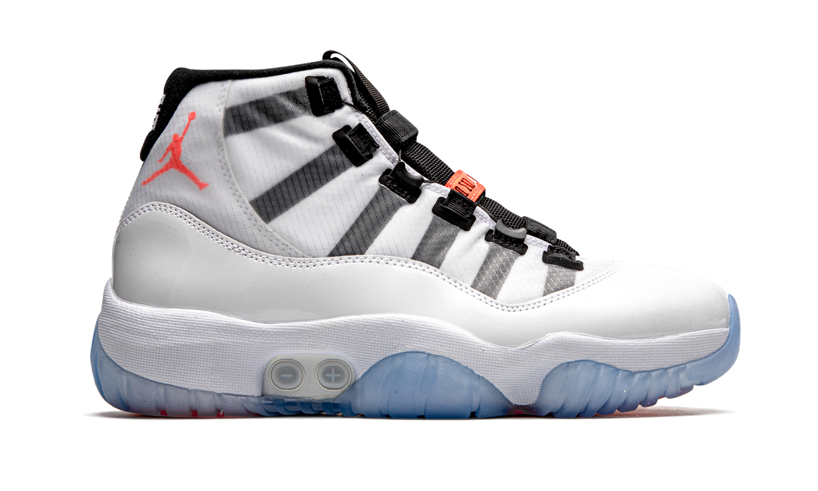 The Air Jordan 11 Adapt “White” is an updated version of Michael Jordan’s eleventh signature shoe with Nike’s futuristic Adapt self-lacing technology. Like Nike Adapt models, the Jordan 11 Adapt allows the wearer to loosen or tighten the shoe via Nike’s Adapt app or by manually pressing the buttons on the midsole. As far as the design of the shoe, the overall look is similar to the original Air Jordan 11, but now incorporates the new wire lacing system. Other design details include a smooth white patent leather mudguard and white mesh around the eyelets. A red Jumpman appears on the collar beneath a semi-translucent film wrapped around the entire upper. The white midsole is raised slightly compared to the original design of the Jordan 11 to house Adapt technology. The release of the Air Jordan 11 Adapt “White” coincides with the shoe’s 25-year anniversary in 2020. Release date: December 30, 2020.