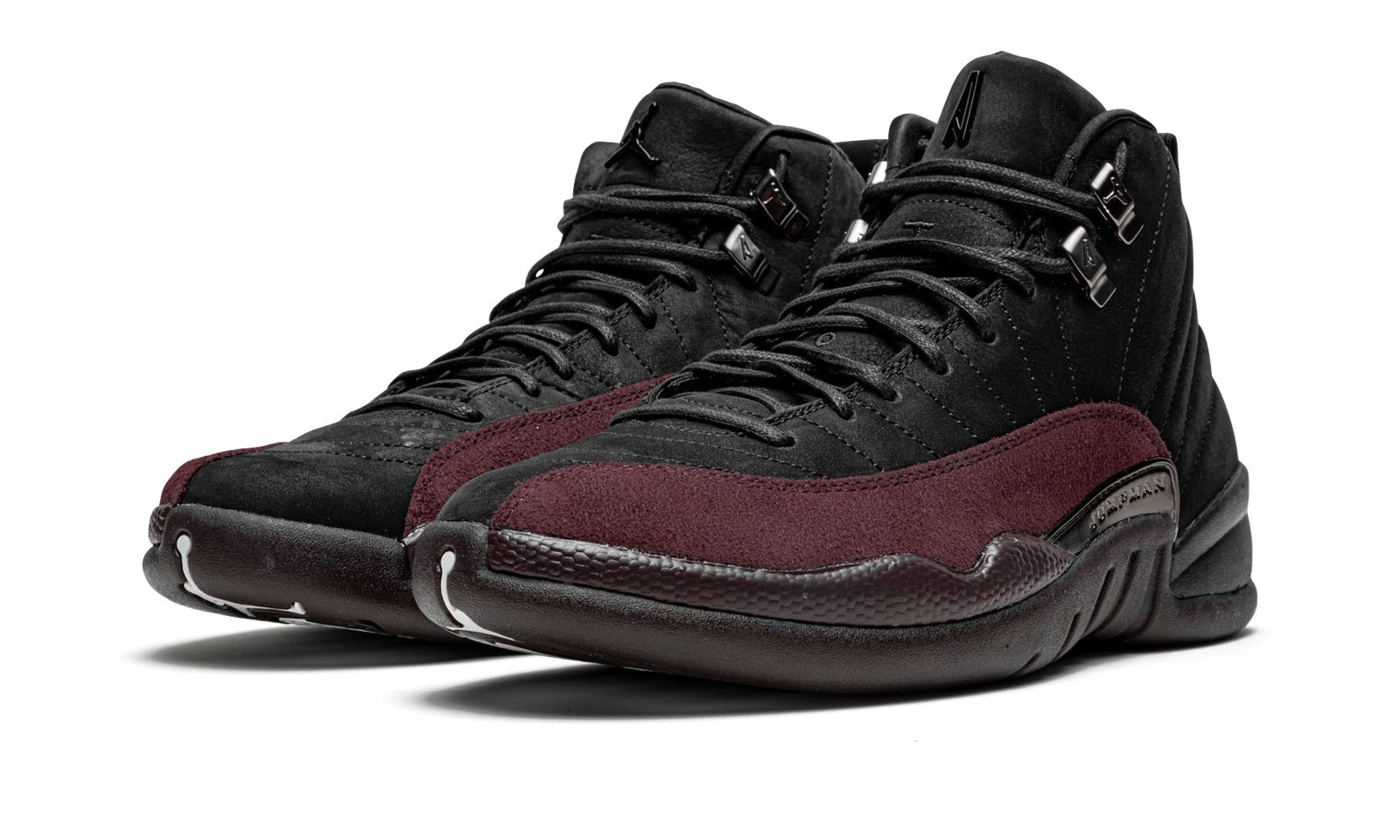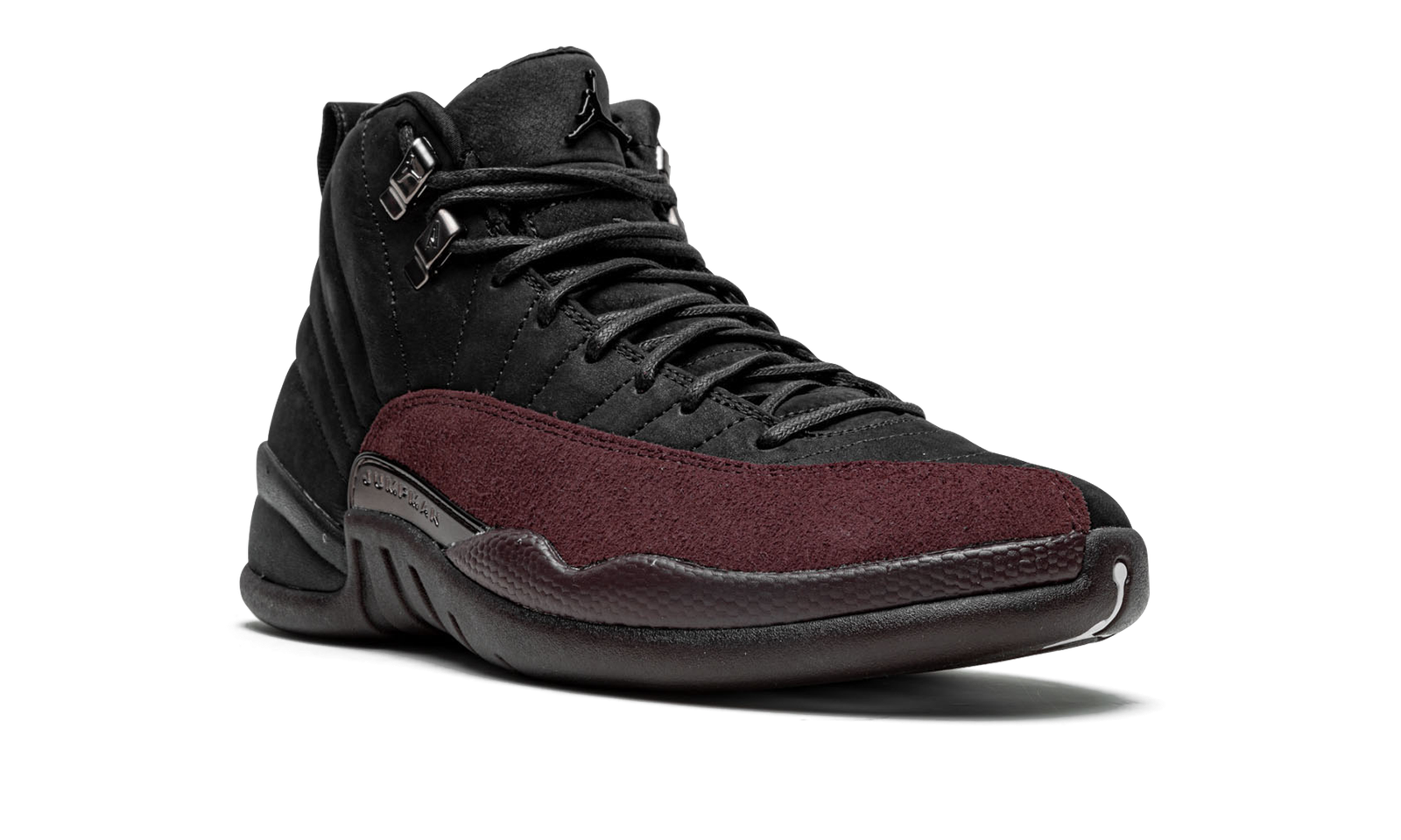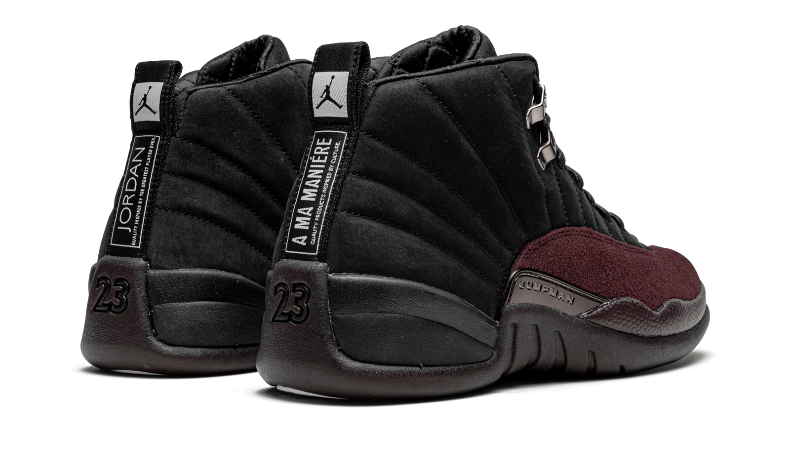 The A Ma Maniére x Air Jordan 12 “Black” is a collaboration by the upscale clothing and sneaker boutique that puts a decidedly premium touch on the classic basketball shoe. Following A Ma Maniére’s Air Jordan 1, Air Jordan 2, Air Jordan 3, and other projects with Jordan Brand, the shop’s Jordan 12 updates Michael Jordan’s twelfth signature shoe with a black and maroon color scheme. The upper features a black nubuck construction with a burgundy forefoot overlay. Dual Jumpman and “A” branding appears on the tongue of the left and right shoe, respectively. Black wax laces and metallic eyelets add a premium aesthetic. The shoe’s burgundy rubber midsole completes the look. The A Ma Maniére x Air Jordan 12 “Black” is one of two Jordan 12 colorways by James Whitner’s clothing and sneaker shop. Release date: February 24, 2023