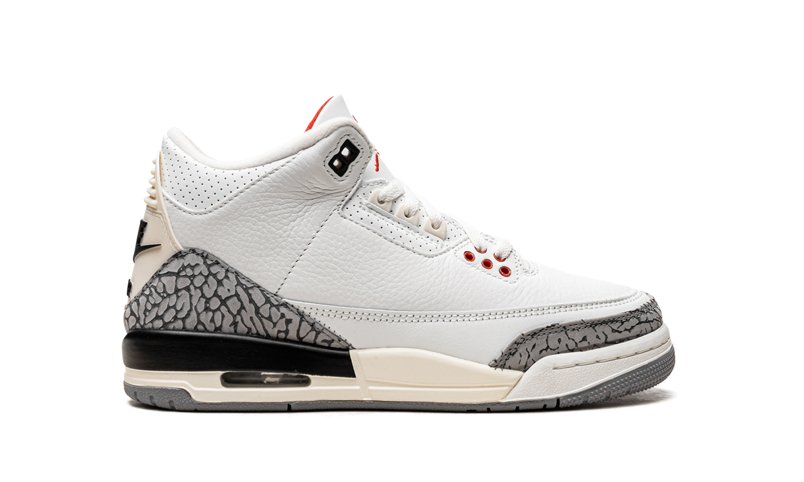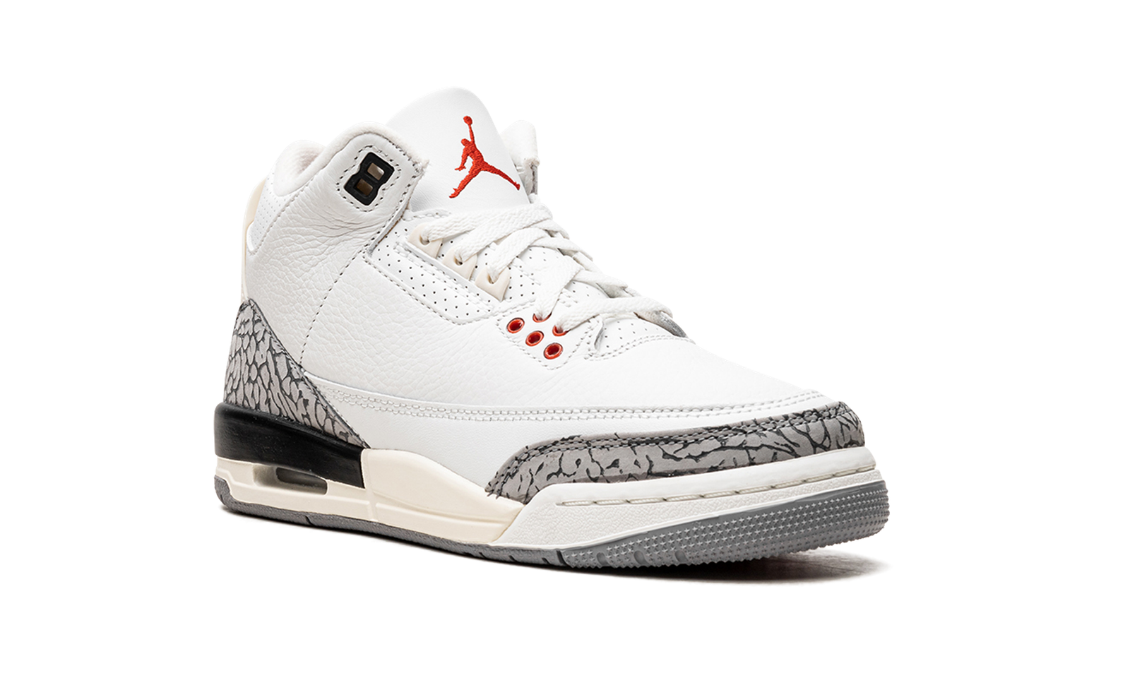 The Air Jordan 3 GS “White Cement Reimagined” is the youth sizing of the special version of the vintage basketball sneaker that replicates its original design. Released in 2023 to celebrate the iconic Jordan 3’s 35th anniversary, the “White Cement Reimagined” retains the look of the model’s “White Cement” colorway with accurate-to-original panels, colors, and overall shape. Faithful to the 1988 version of the Jordan 3 “White Cement,” the “Reimagined” features a higher-cut ankle collar inspired by the OG Jordan 3’s design. It also is equipped with a white leather upper with contrasting grey elephant print on the toe and heel, which has also been modified to look like the detailing on the original Jordan 3. The “Nike Air” branded heel counter has an aged, vintage look, as does the midsole. Release date: March 11, 2023