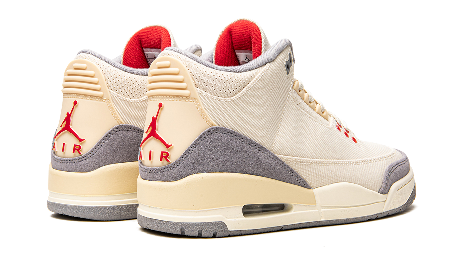 The Air Jordan 3 “Muslin” is a March 2022 release of Michael Jordan’s third signature shoe in a colorway that modifies the silhouette’s original design in a more streamlined appearance. The “Muslin” is a versatile look for the vintage basketball shoe that features a Sail-colored canvas upper with contrasting grey suede panels on the toe and heel that replace the Jordan 3’s original elephant print design. A darker shade of cream white is found on the eyelets, heel tab, and midsole. Jordan Brand places a red Jumpman on the tongue and on the heel beneath the “Air” branding. Release date: March 25, 2022