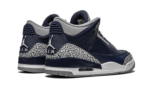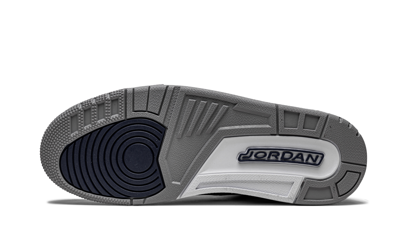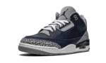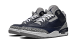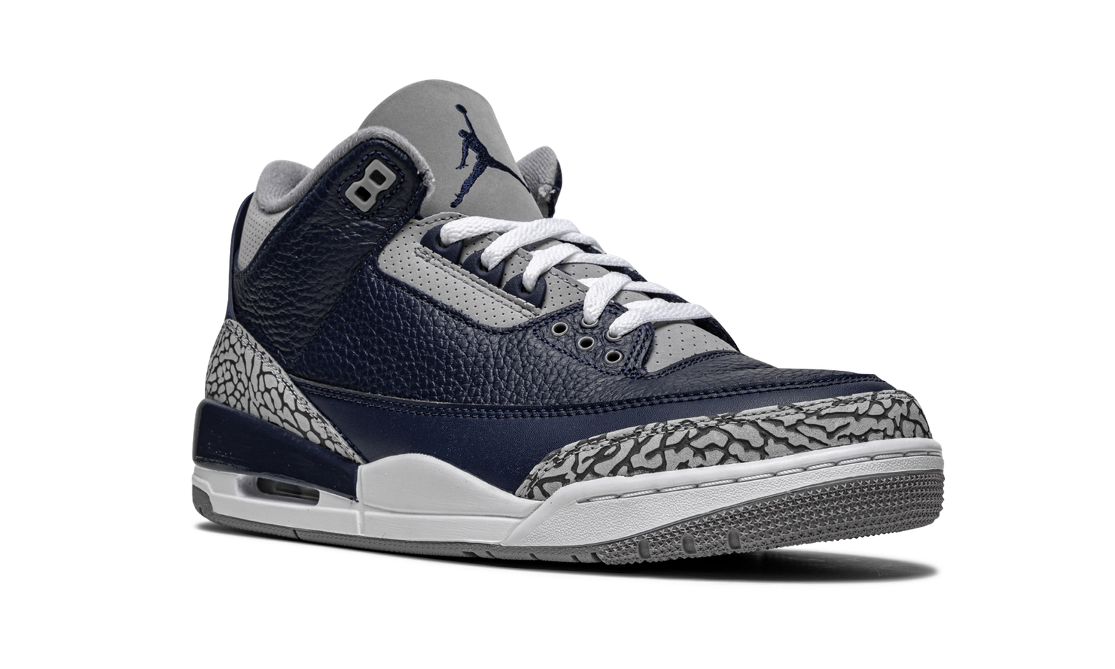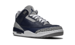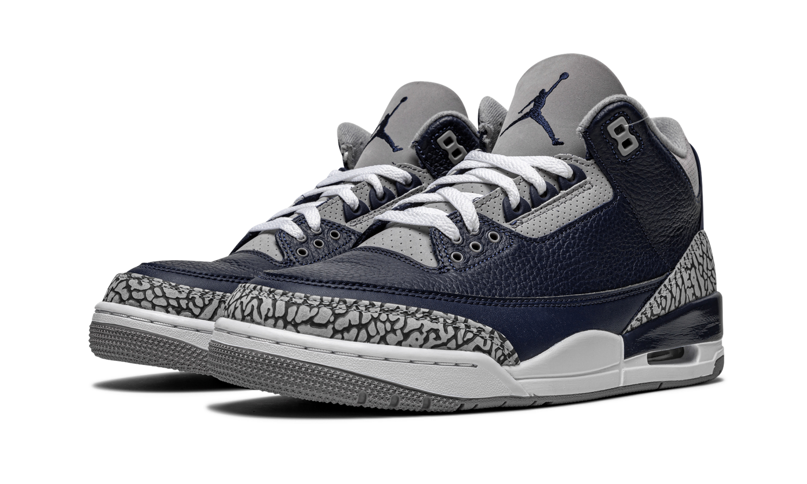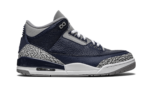 The Air Jordan 3 “Georgetown” is a March 2021 release of Michael Jordan’s third signature shoe in a Georgetown Hoyas inspired colorway. Unofficially, the “Georgetown” honors the college basketball powerhouse by employing the team’s uniform colors in its design. The look references many of the Player Exclusive “Georgetown” colorways given to members of the Hoya family by Jordan Brand. Details include a Midnight Navy tumbled leather upper with contrasting dotted Cement Grey leather panels on the eyelets, collar, and tongue. Classic elephant print appears on the heel and toe as per the original styling of the Air Jordan 3. Additional design cues include a navy blue embroidered Jumpman on the grey leather tongue, white laces, and a white Jumpman on the heel. A visible Air unit in the heel of the white midsole completes the look of this “Georgetown” edition of the Jordan 3. Release date: March 20, 2021.