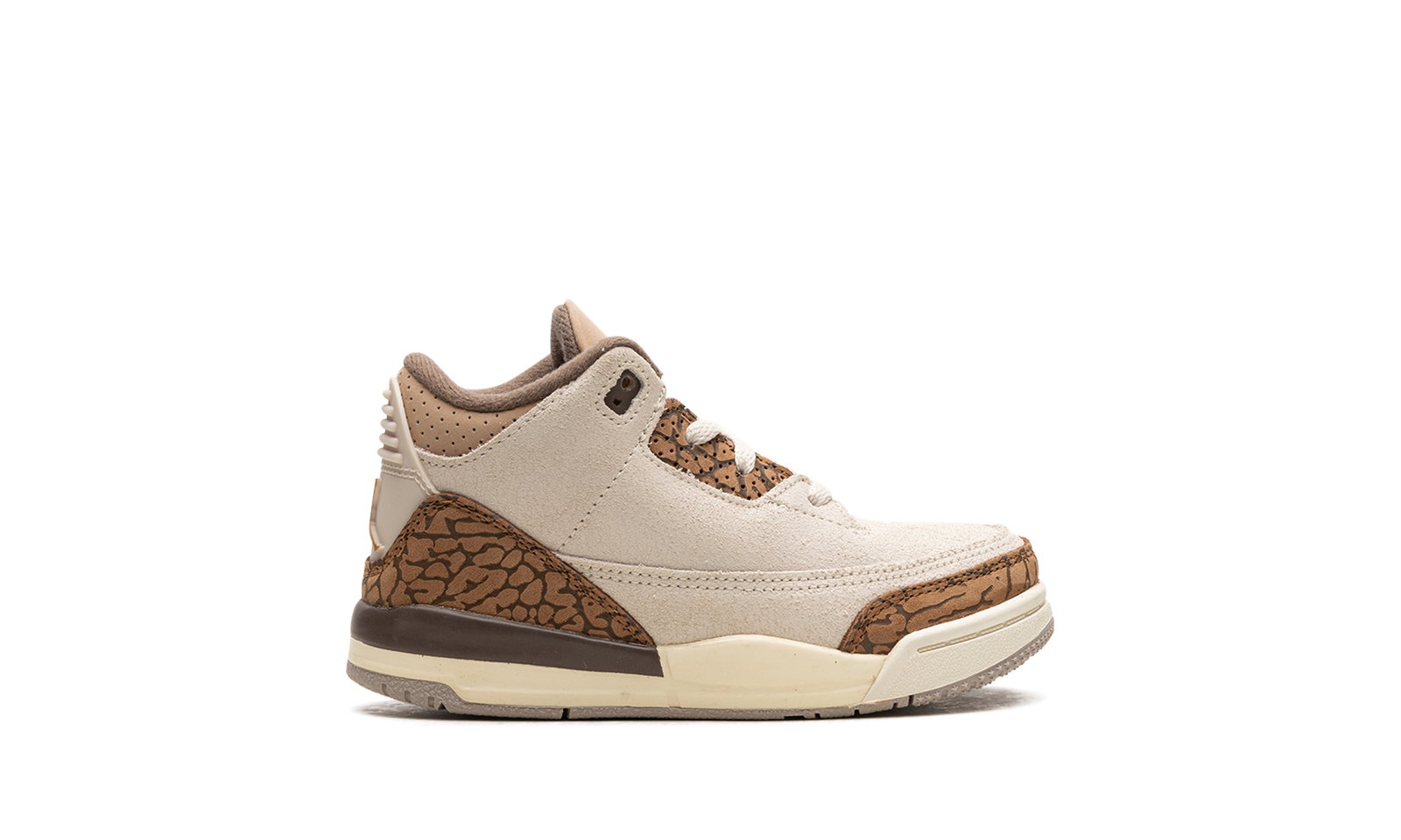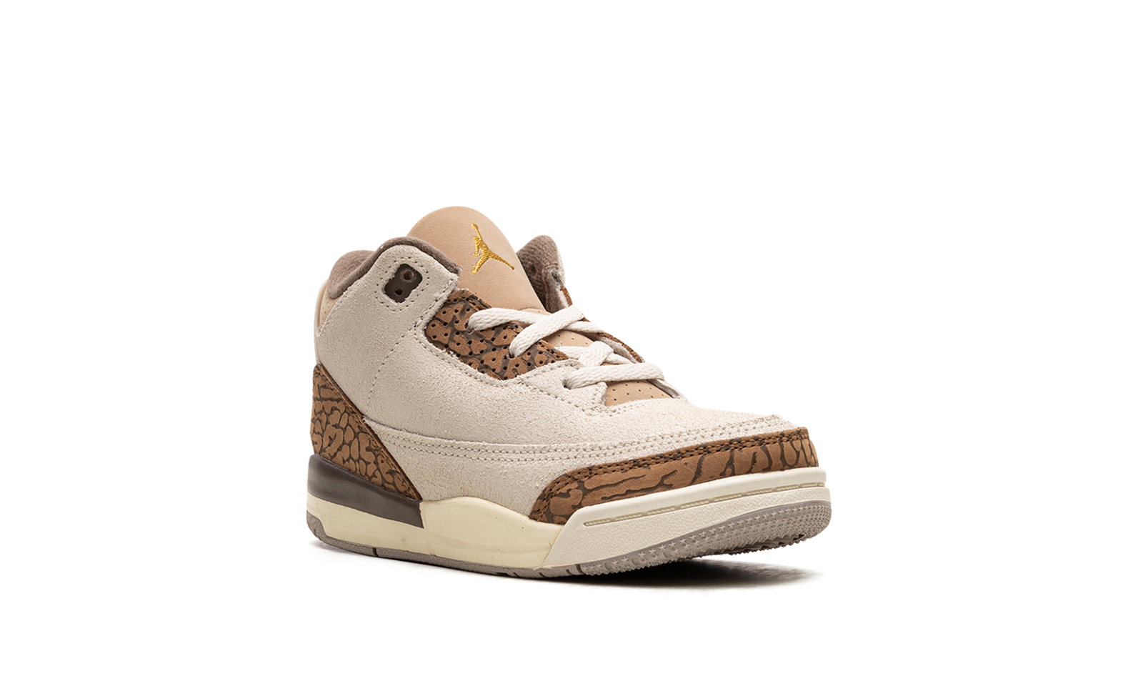 The Air Jordan 3 TD “Palomino” is the toddler sizing of Michael Jordan’s third signature shoe in a colorway made of unique materials. The upper has a Palomino-colored suede construction with dark tan elephant print on the toe, eyelet panel, and heel. A Metallic Gold Jumpman appears on the tongue and on the heel. Both the collar and tongue are designed in tan leather and complement the shoe’s earth tone appearance. A cream midsole completes the premium colorway. Release date: July 29, 2023