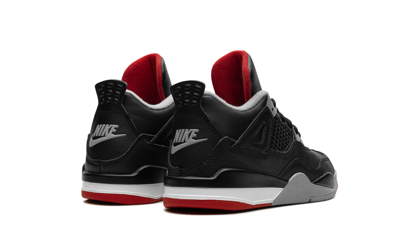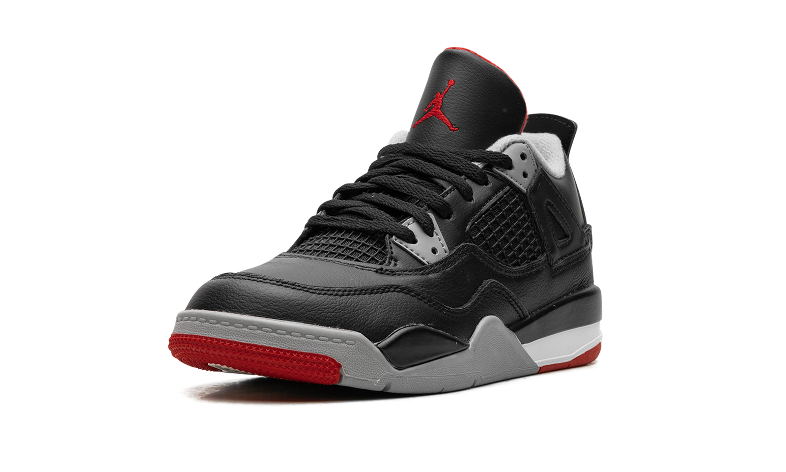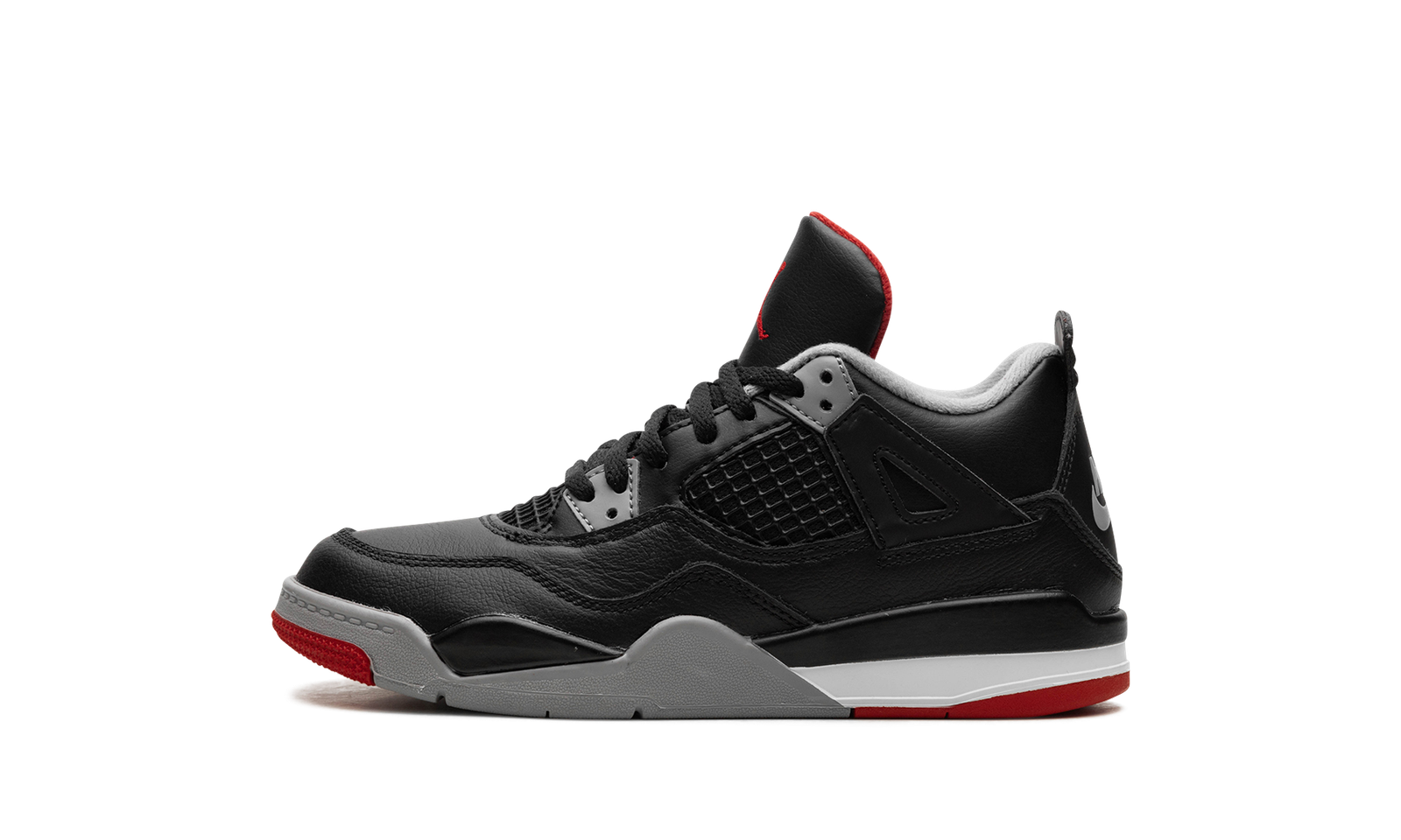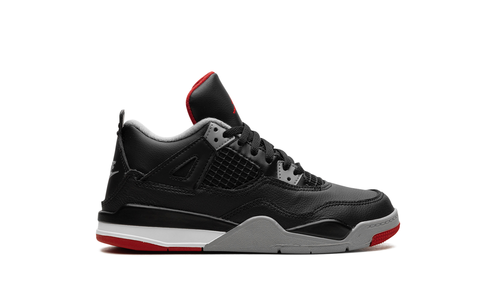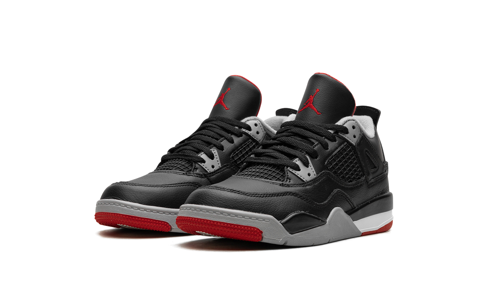 The Air Jordan 4 PS “Bred Reimagined” is the preschool sizing for the colorway of the retro basketball shoe that updates an original design with a new leather construction. The “Bred Reimagined” was released in February 2024 in celebration of the Jordan 4’s 35th anniversary. The colorway mimics the original “Bred” Jordan 4 from 1988, but is designed with a black leather upper instead of nubuck, the material that was found on the original version. Black netting is in its usual places for the Jordan 4 on the midfoot and tongue. Cement Grey Nike branding is seen on the heel counter. A red Jumpman is embroidered on the tongue tag. Release date: February 17, 2023