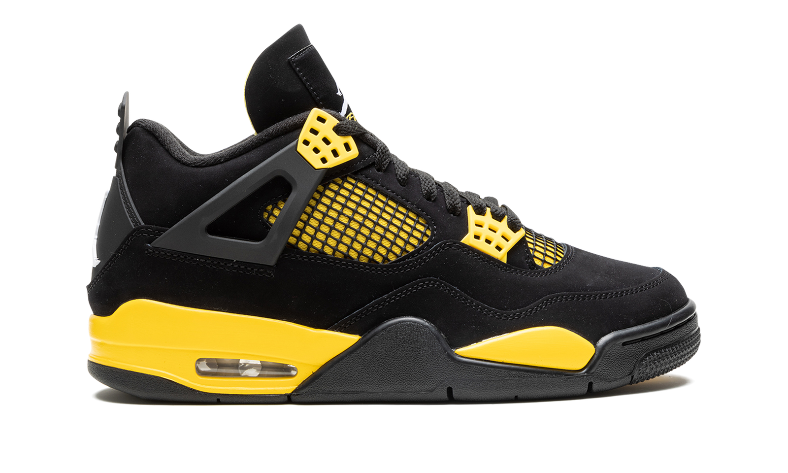 The Air Jordan 4 “Thunder 2023” is the modern re-release of the popular, non-original colorway of the retro basketball shoe that debuted in 2006’s “Thunder & Lightning” collection. Released alongside the Jordan 4 “Lightning” in super limited quantities on Jordan Brand’s former Jumpman23.com website in the mid-aughts, the “Thunder” was brought back in 2012 before it received another highly anticipated release in 2023. As for its design, the black-and-yellow shoe features a black synthetic nubuck base with Tour Yellow detailing beneath the mesh on the sides and tongue. Yellow “wings” lace holders contrast the black upper. A white Jumpman appears on the heel and on the tongue. A visible Air unit in the heel puts the finishing touches on the Air Jordan 4 “Thunder.” Release date: May 13, 2023
