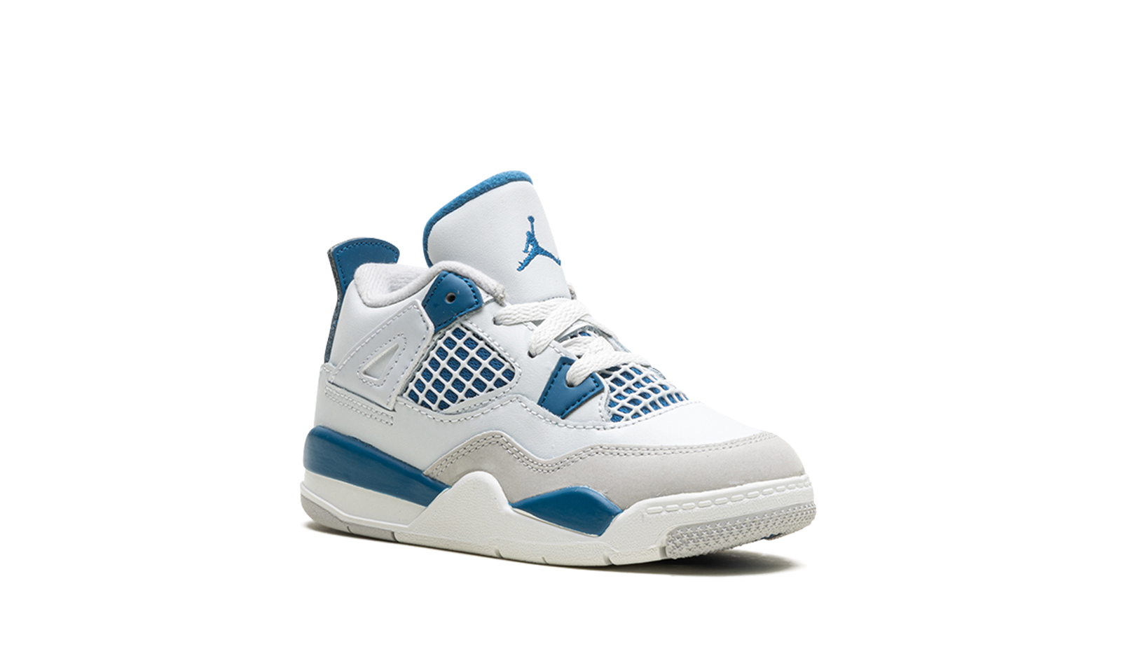 The Air Jordan 4 OG TD “Military Blue” is the toddler sizing of the original colorway of Michael Jordan’s fourth signature shoe that was re-released by Jordan Brand in May 2024. The Jordan 4 “Military Blue” is one of the retro basketball sneaker’s original colorways, and one of its rarest, too. The style was only released twice before, in 1989 and 2006, until it was brought back in 2024. The modern version of the “Military Blue” remains faithful to the original look, in that it features the same shape, color block, and “Nike Air” branding as the ‘89 version. The shoe has a white leather upper with a Neutral Grey overlay on the toe. Additional Neutral Grey accenting appears on the lace holder “wings.” White netting is layered over Military Blue mesh on the mid-panel and tongue. More Military Blue accenting comes into play on the mudguard and lace eyelets, and on the heel counter with “Nike Air” detailing. A blue Jumpman is found on the tongue. Underfoot, a white rubber midsole and grey rubber outsole complete the look. Release date: May 4, 2024