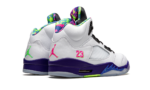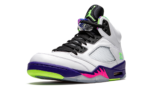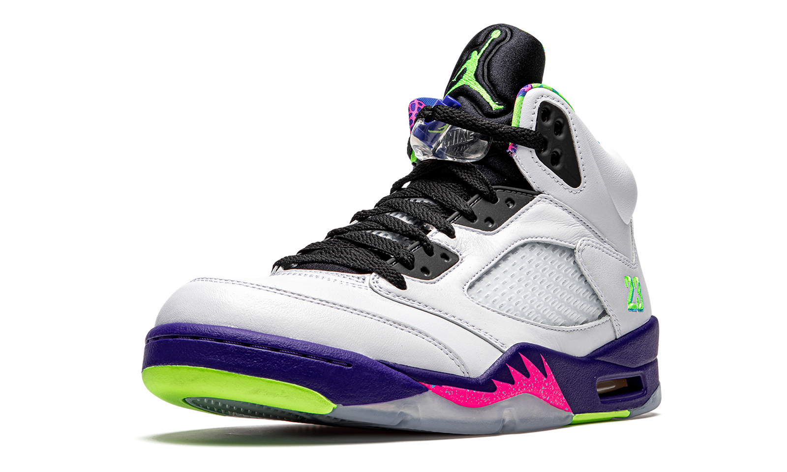 The Air Jordan 5 “Alternate Bel-Air” (also known as “Ghost Green”) is reminiscent of the coveted “Bel-Air” colorway of Michael Jordan’s fifth signature shoe. Both the original “Bel-Air” and “Alternate Bel-Air” are inspired by the “Grape” Jordan 5 worn by Will Smith on the “Fresh Prince of Bel-Air” in the ‘90s. The “Alternate Bel-Air” flips the decidedly throwback color scheme for a fresh new take. White leather appears on the upper, including the toe, collar, and heel. Vibrant contrasting Ghost Green and red “23” and Jumpman embroidery can be found on the heel of the left and right shoes, respectively. Translucent netting dots the mid-panel and tongue. Red Jumpman branding appears on the black neoprene tongue of the left pair, and Ghost Green Jumpman detailing appears on black tongue of the right shoe. Both pairs are finished off in purple midsoles with red shark tooth detailing on the forefoot and visible Air in the heel. Release date: August 15, 2020.