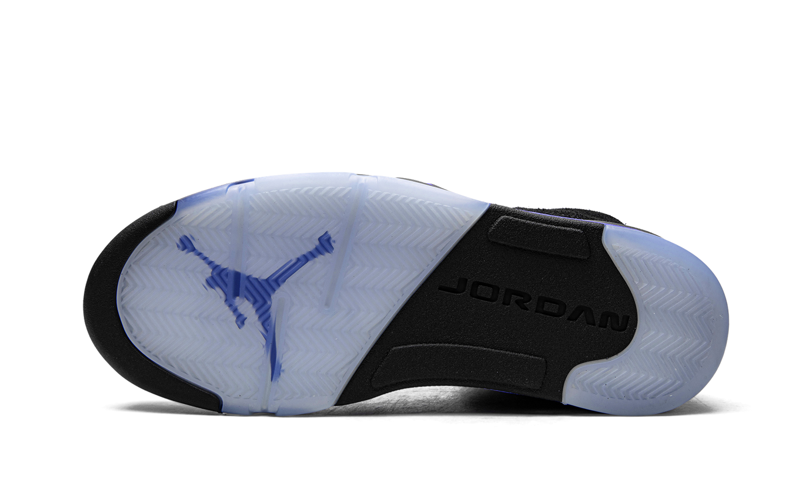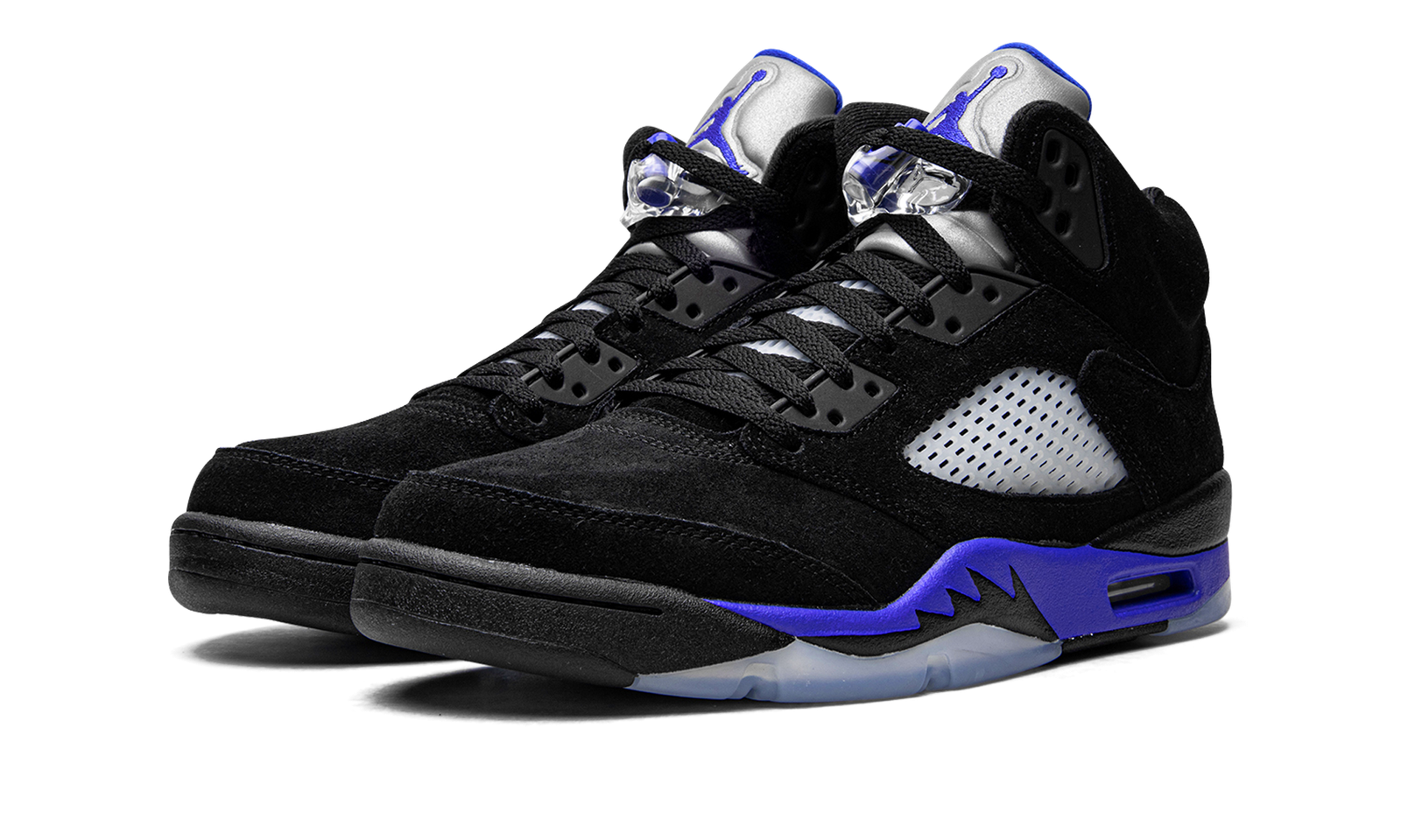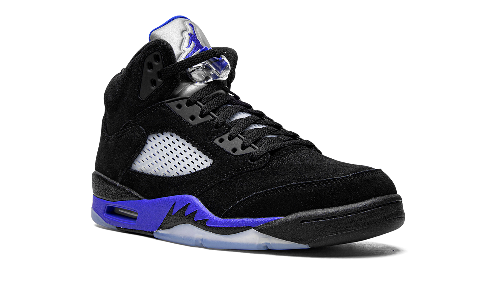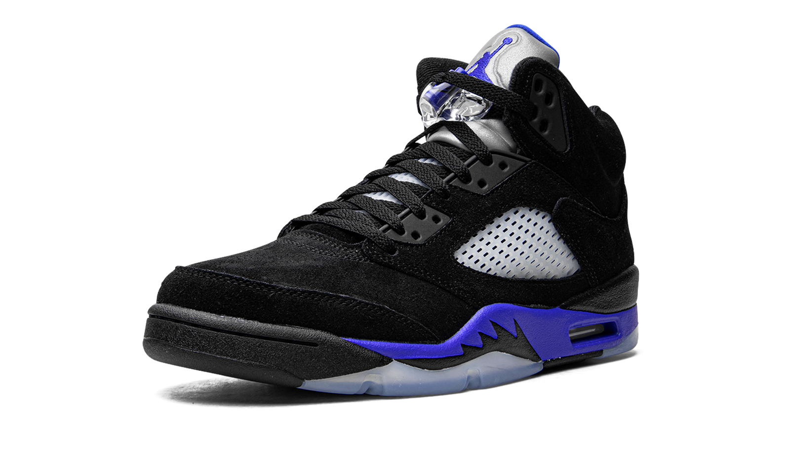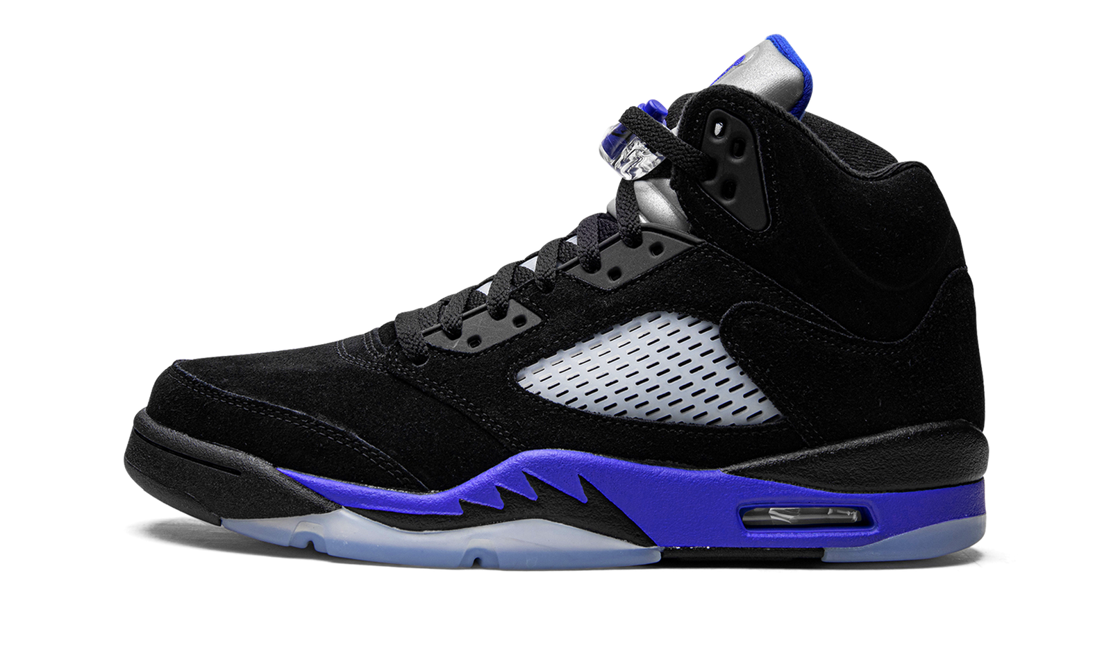 The Air Jordan 5 “Racer Blue” is a February 2022 release of Michael Jordan’s classic signature shoe in a colorway that is reminiscent of the original “Black Metallic” colorway. This “Racer Blue” edition replaces red accents with royal blue, and adds even more color by featuring a blue midsole, as well. The upper is constructed in black synthetic nubuck with translucent mesh panels on the sides and tongue. The silver reflective tongue has a Racer Blue embroidered Jumpman and a Racer Blue Jumpman is embroidered on the heel. Additional Racer Blue accenting comes into play on the underside of the tongue, on the toggle on the clear lace lock, and on the midsole with silver shark tooth-inspired detailing. Release date: February 22, 2022