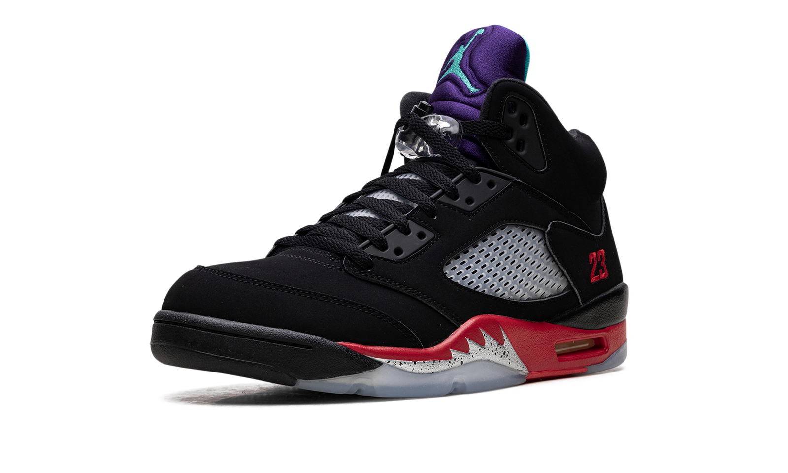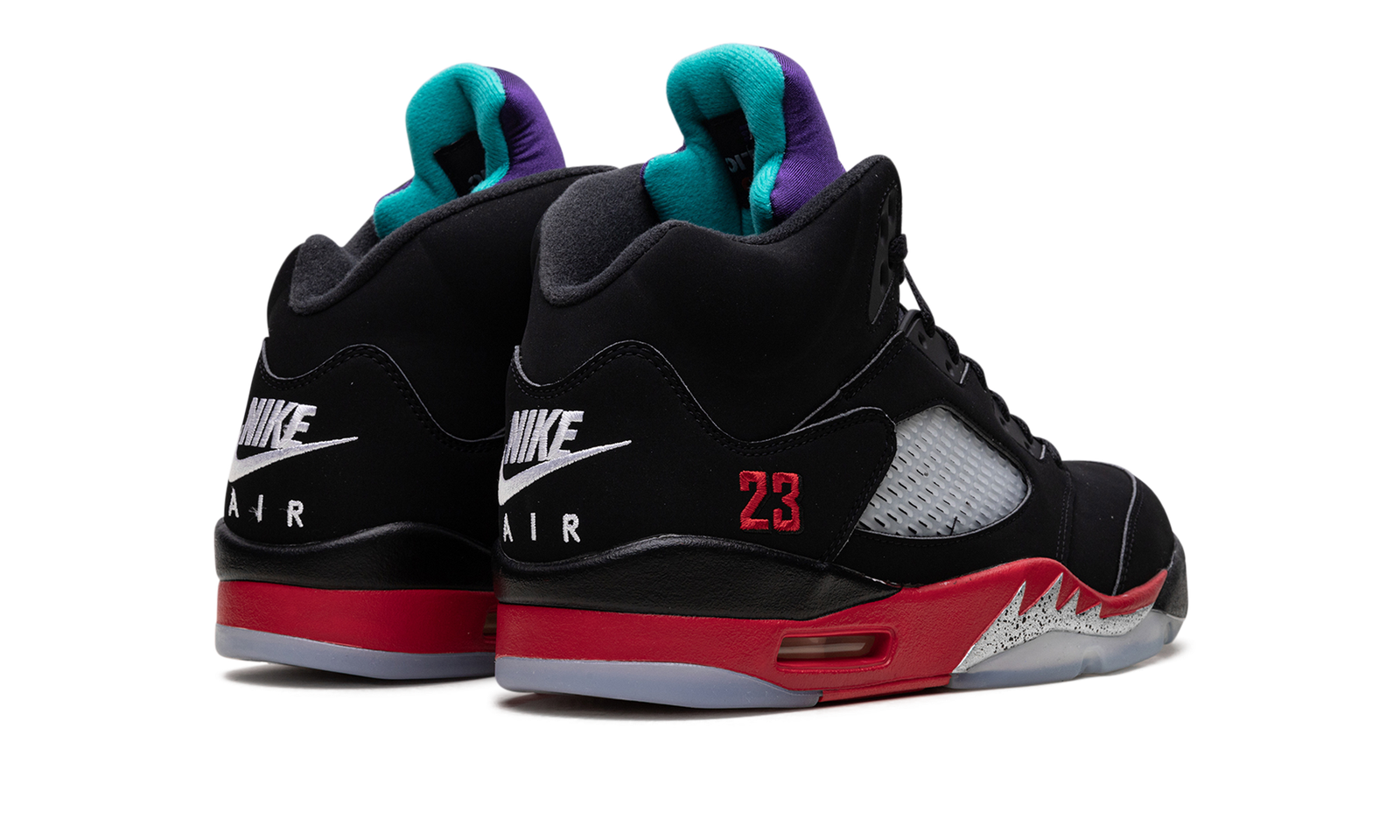 The Air Jordan 5 “Top 3” is an amalgamation of three of the most heralded colorways to have appeared on Michael Jordan’s fifth signature shoe. The “Grape,” “Fire Red,” and “Black Metallic” all are incorporated into the design of this shoe. The upper sports a black nubuck composition taken directly from the “Black Metallic” look. Translucent netting is located on the mid-panel while the tongue is inspired by the groovy ‘90s-era “Grape” design. Embroidered red “23” branding on the quarter panel and embroidered white “Nike Air” detailing on the heel provide a healthy dose of nostalgia. The Air window in the heel is encased within a fiery red midsole that features cement shark tooth detailing. Jordan Brand finishes off the look with an icy translucent outsole. Release date: May 30, 2020.