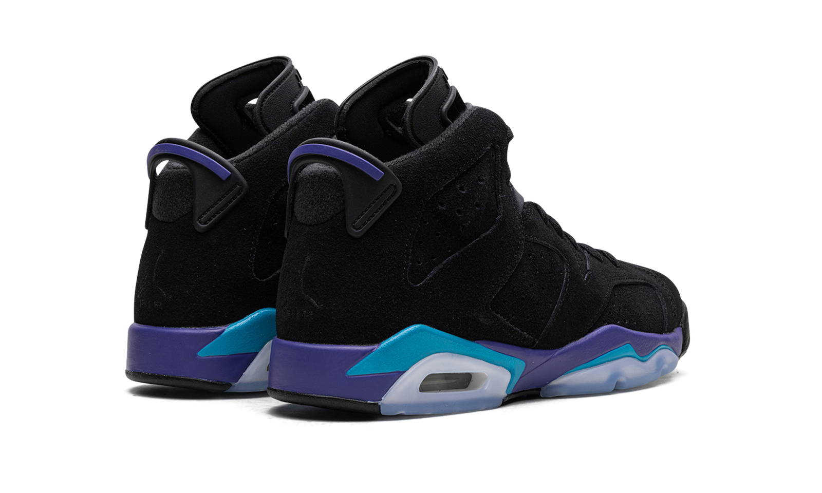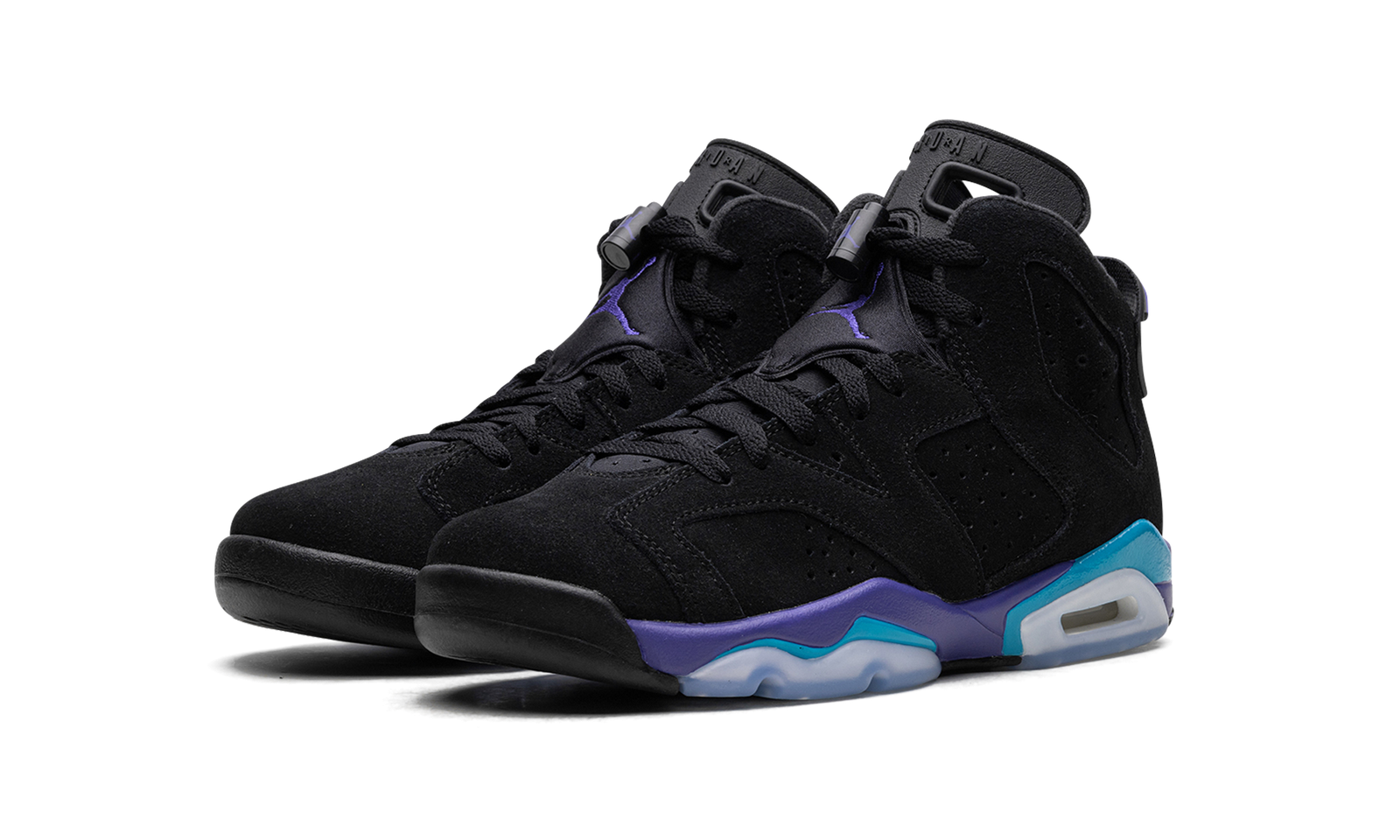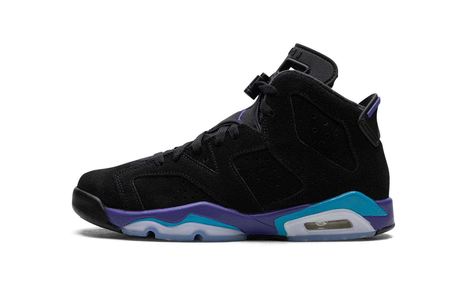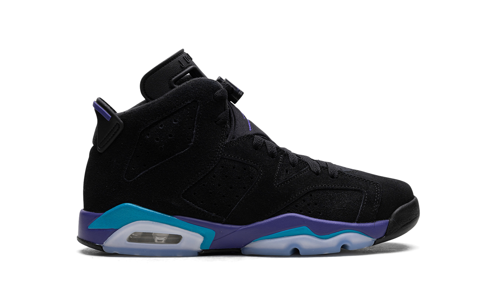 The Air Jordan 6 GS “Aqua” is the youth sizing of Michael Jordan’s sixth signature shoe inspired by an iconic Air Jordan colorway. The shoe in question is the Air Jordan 8 “Aqua,” an original colorway of the model that was worn by Jordan during the 1993 NBA All-Star Game. Jordan Brand transfers the Jordan 8 “Aqua’s” color scheme onto the Jordan 6 by featuring the shoe’s Bright Concord and Aquatone accents on the midsole. As for the rest of the shoe, the colorway features a black synthetic nubuck construction with tonal overlays. A Bright Concord Jumpman is embroidered on the tongue while a teal Jumpman is seen on the purple lace toggle. On the back of the shoe, a black spoiler with Aqua accents completes the design. Release date: October 7, 2023