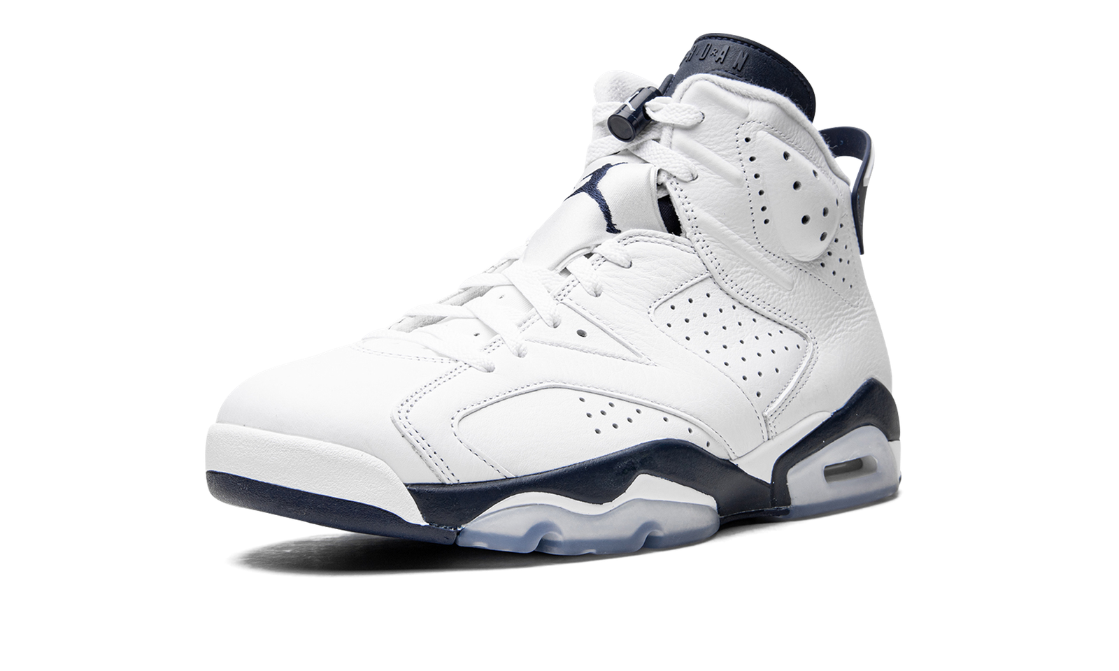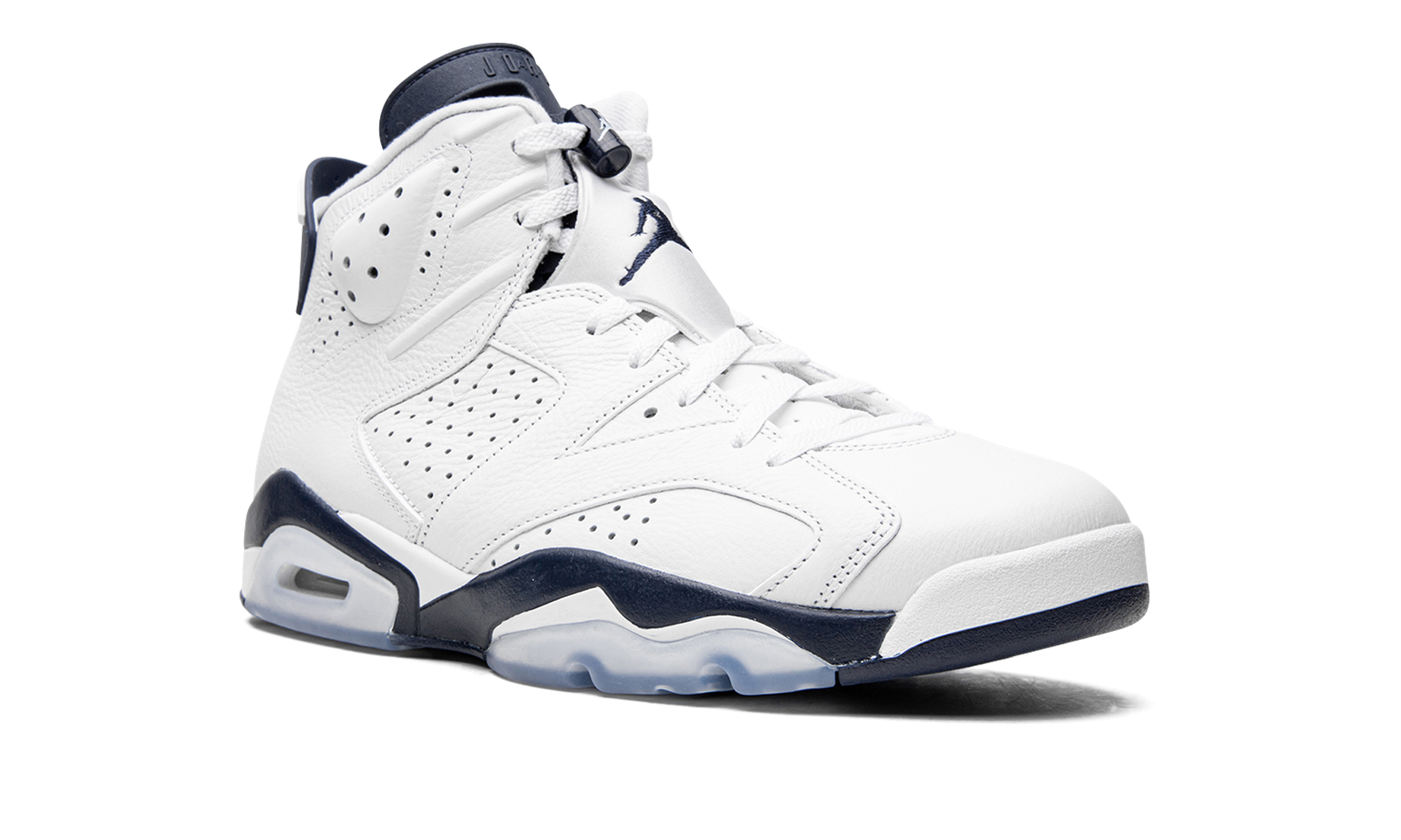 The Air Jordan 6 “Midnight Navy” is a non-original colorway of Michael Jordan’s sixth signature shoe that originally debuted in 2000 and was brought back in early 2022. The “Midnight Navy” was once part of Jordan Brand’s “Retro+” collection, a series of non-original colorways from the late ‘90s and early 2000s that put a new “lifestyle” spin on classic Air Jordan models, like the Air Jordan 6. Interestingly, the “Midnight Navy” colorway of the vintage basketball shoe is styled similarly to the model’s “White Infrared,” “Sport Blue,” and original “Maroon” looks. The entire upper, including the perforated panels on the sides, the perforated collar, and overlays, appear in white tumbled leather. A Midnight Navy Jumpman is embroidered onto the white nylon lace overlay. Additional Midnight Navy accenting comes into play on the lace toggle with white Jumpman branding, on the tongue, and on the spoiler on the heel. A navy blue Jumpman is stitched onto the heel above white “Air” branding. Release date: March 2022