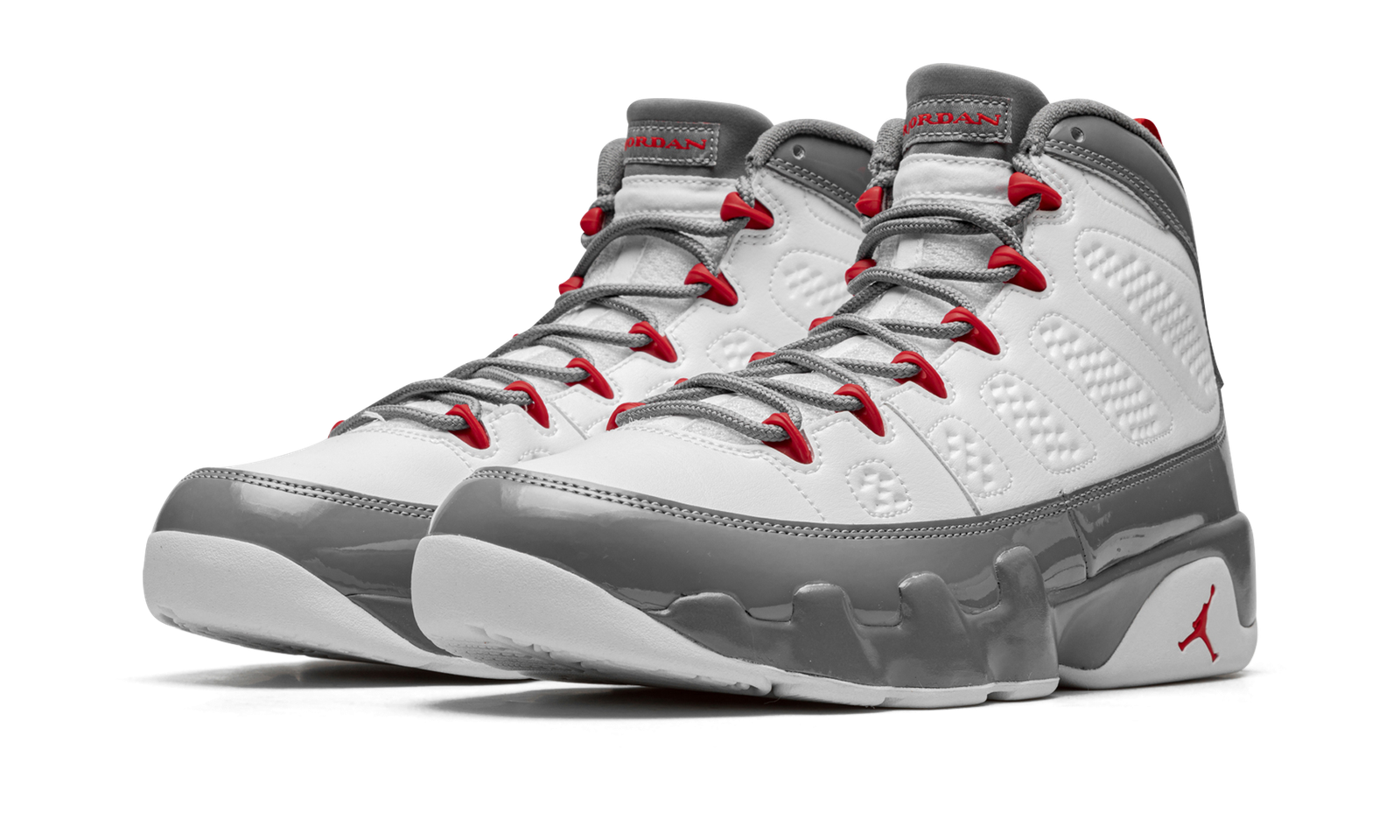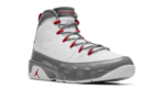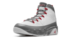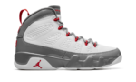 The Air Jordan 9 “Fire Red” is a colorway of Michael Jordan’s ninth signature shoe that is loosely inspired by the Chicago Bulls. As with other classic and popular Air Jordans in “Fire Red” colorway, this Jordan 9 features a fiery shade of red that is found on the Bulls’ team uniforms. The shoe features a white leather construction with a contrasting grey patent leather mudguard overlay that extends from the toe up to the collar. Fire Red accents are found on the eyelet loops, on the pull tab on the heel, and on the “Jordan” branding on the tongue. A Fire Red Jumpman also appears on the lateral side of the white foam midsole. Release date: November 23, 2022