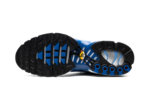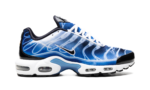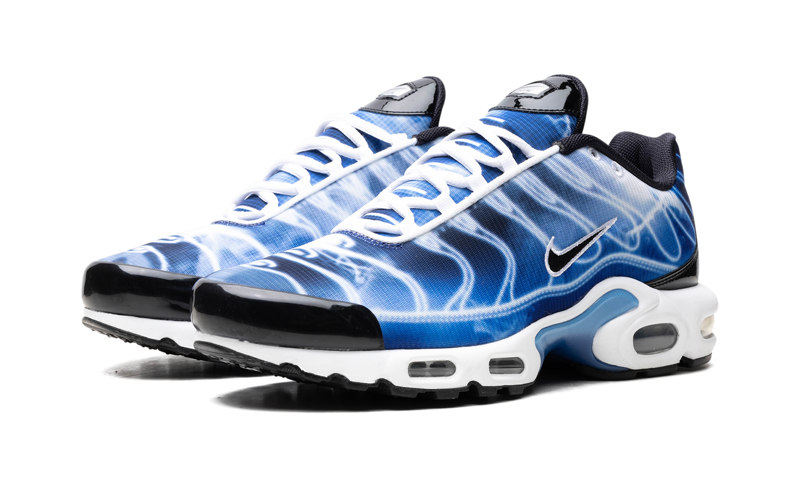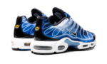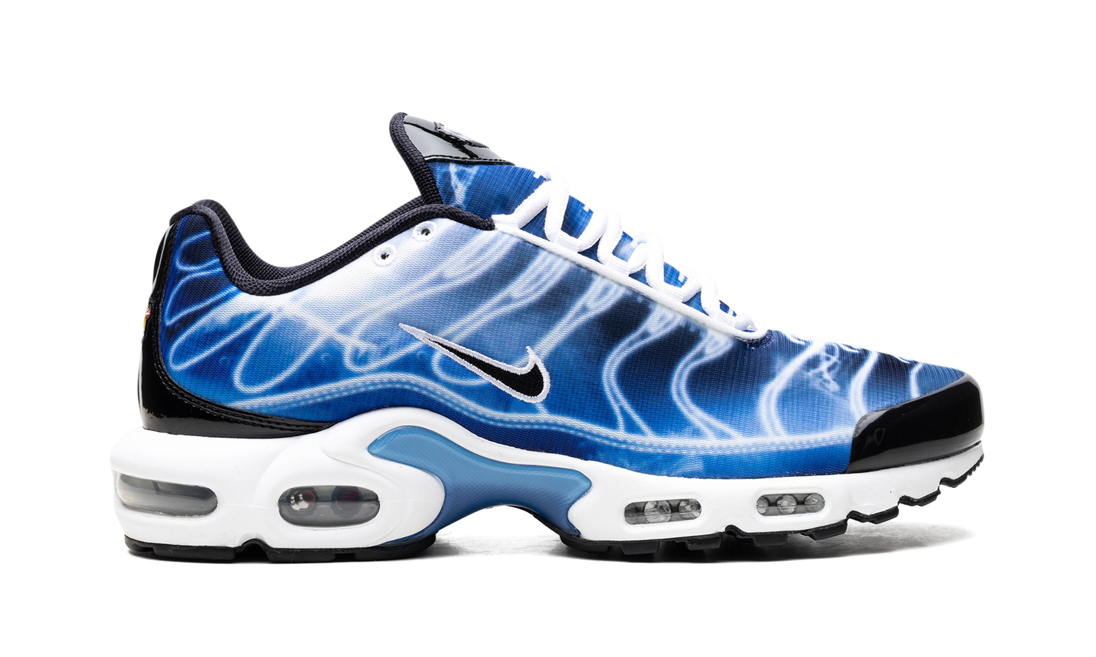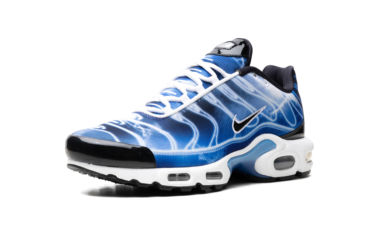 The Nike Air Max Plus “Light Streaks” is a colorway of the retro performance running shoe with a predominately blue appearance. One of multiple colorways released in celebration of the Air Max Plus’s 25th anniversary in 2023, the “Light Streaks” features a gradient white-and-blue upper with light streak outlines in place of the model’s original palm tree inspired TPU overlays. A black Swoosh appears on either side of the shoe. Glossy black panels can be seen on the forefoot and spine. Yellow “TN” badge (for Tuned Air) is seen on the heel. Underfoot, the shoe’s white foam midsole has Air bubbles in the forefoot and heel. Release date: November 30, 2023