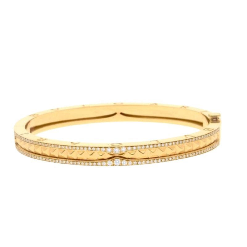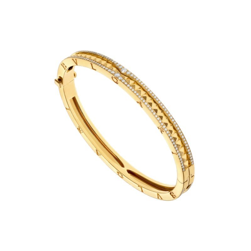The B.zero1 Rock collection draws inspiration from the world-famous amphitheater, the Colosseum, and embodies the creative vision and uninhibited style of Bvlgari. The unique spiral design is reinterpreted with gold studs, challenging the essence of jewelry aesthetics and highlighting the freedom and forward-looking spirit of Bvlgari’s classic design. B.zero1 Rock series 18K yellow gold bracelet, decorated with pave diamonds