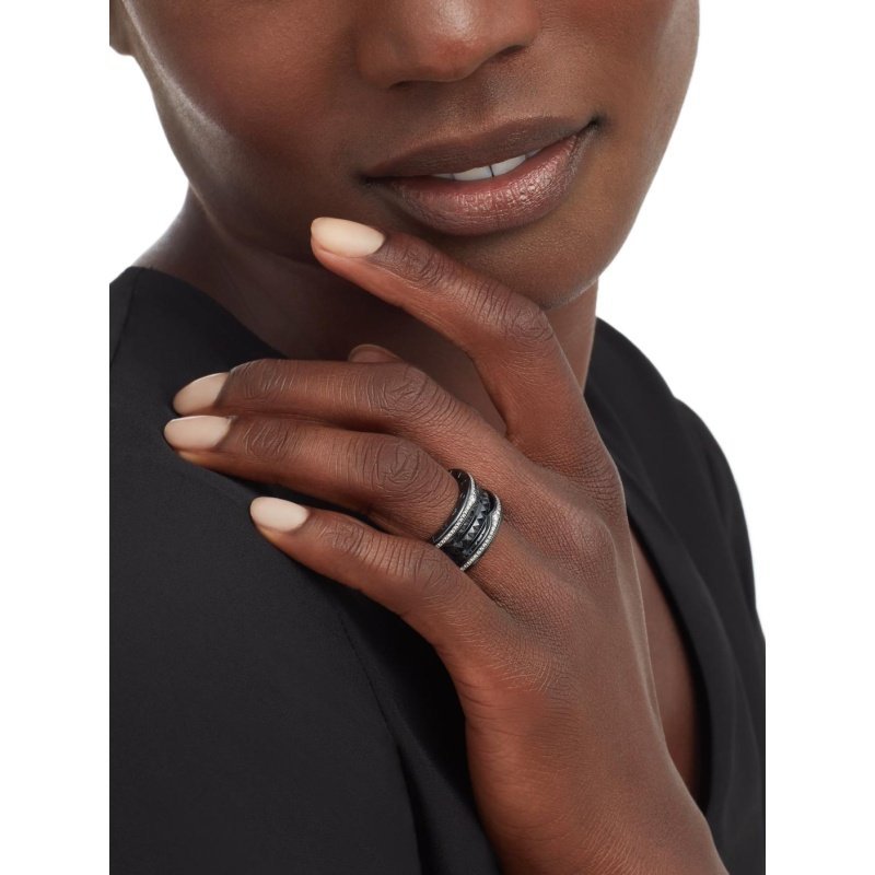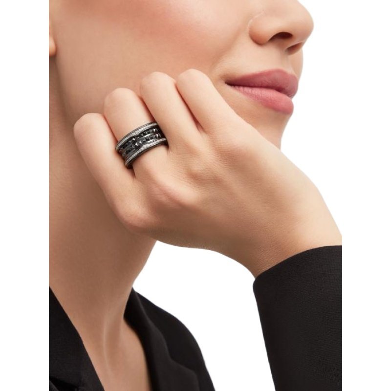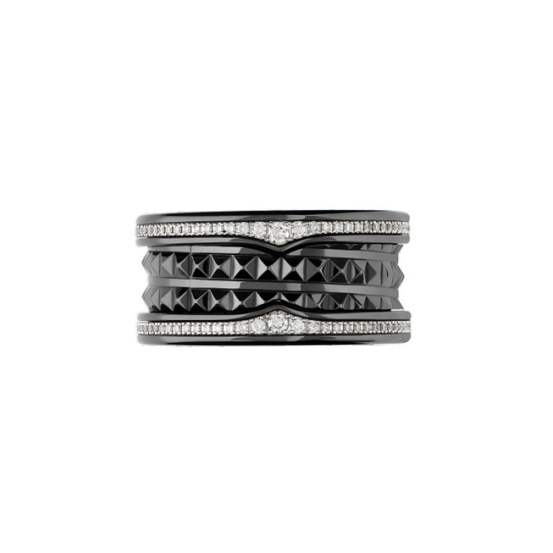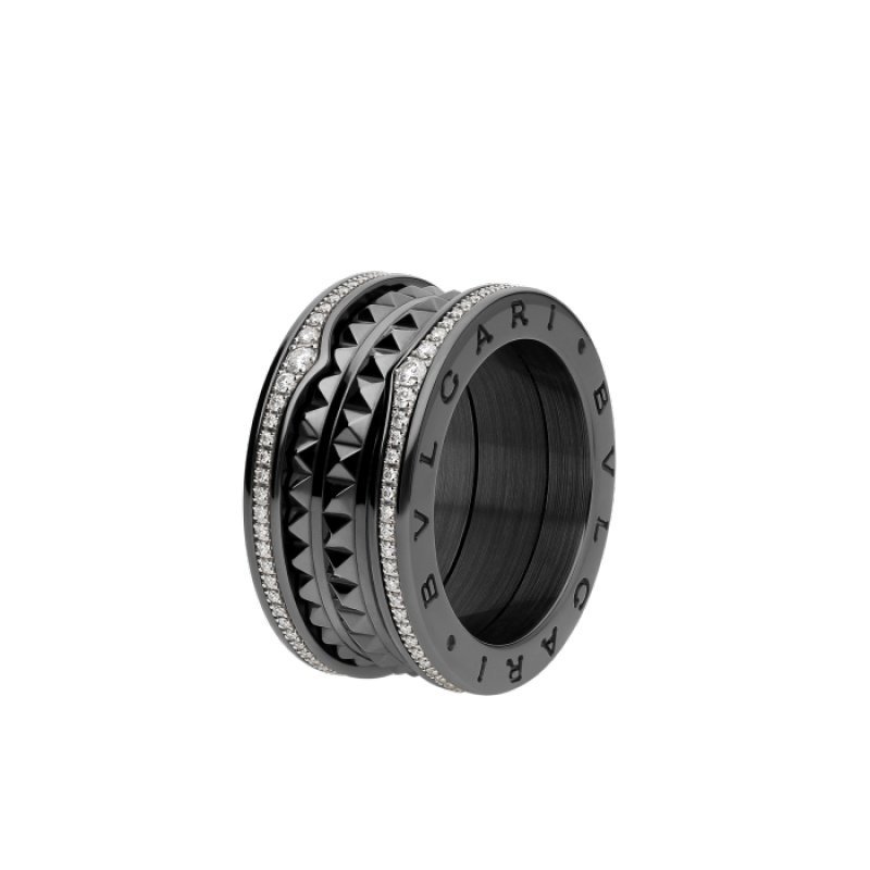 B.zero1 Rock series four-band ring, made of black ceramic, decorated with pave diamonds.
