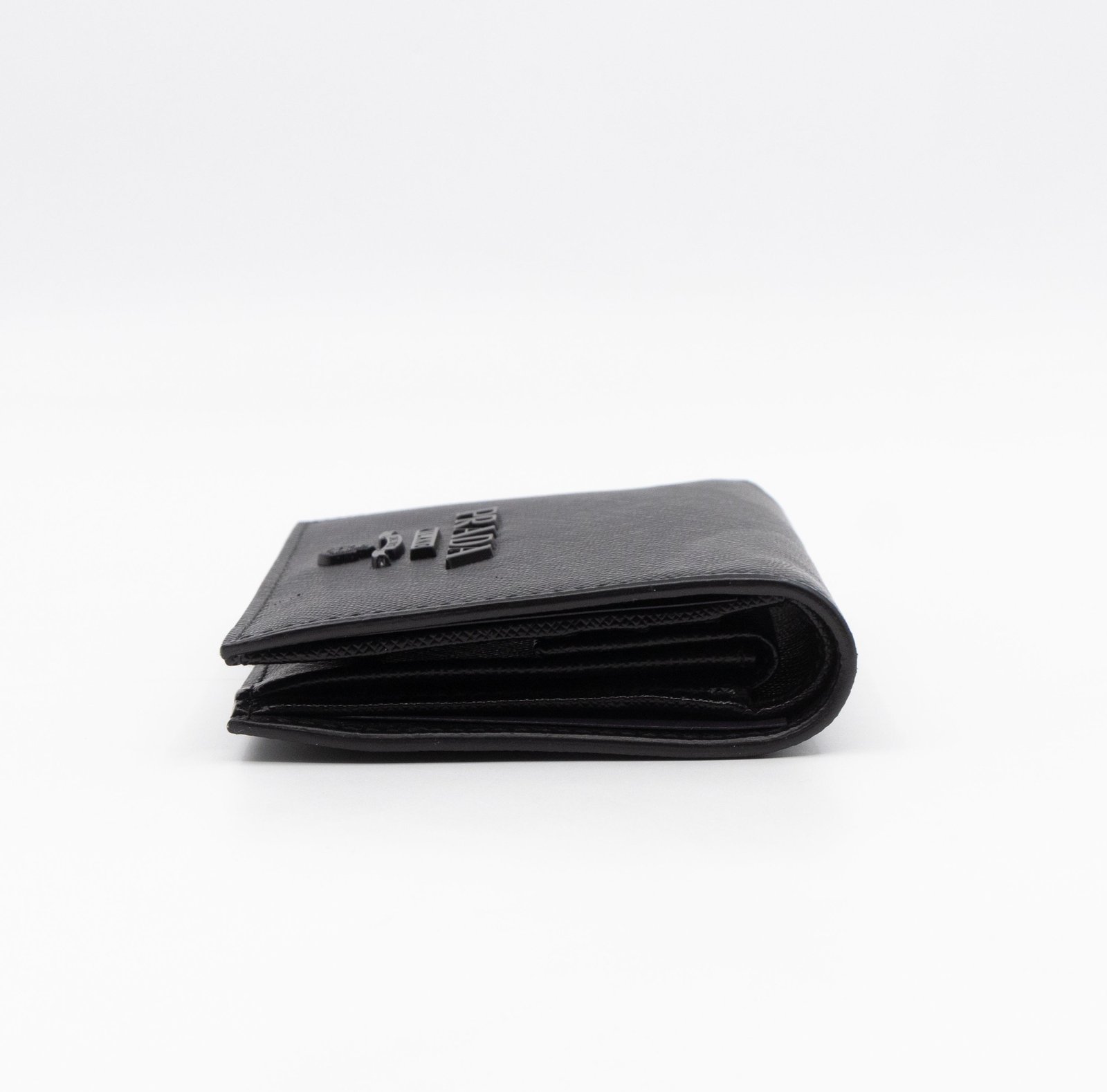 A Bifold Wallet from Prada. This everyday accessory is made with black saffiano shine leather and gold-tone hardware. Opens to matching black leather with card slots, patch pocket, and a small interior pocket with snap button perfect for organizing coins or small items, providing both style and practicality. The retail price is $495.