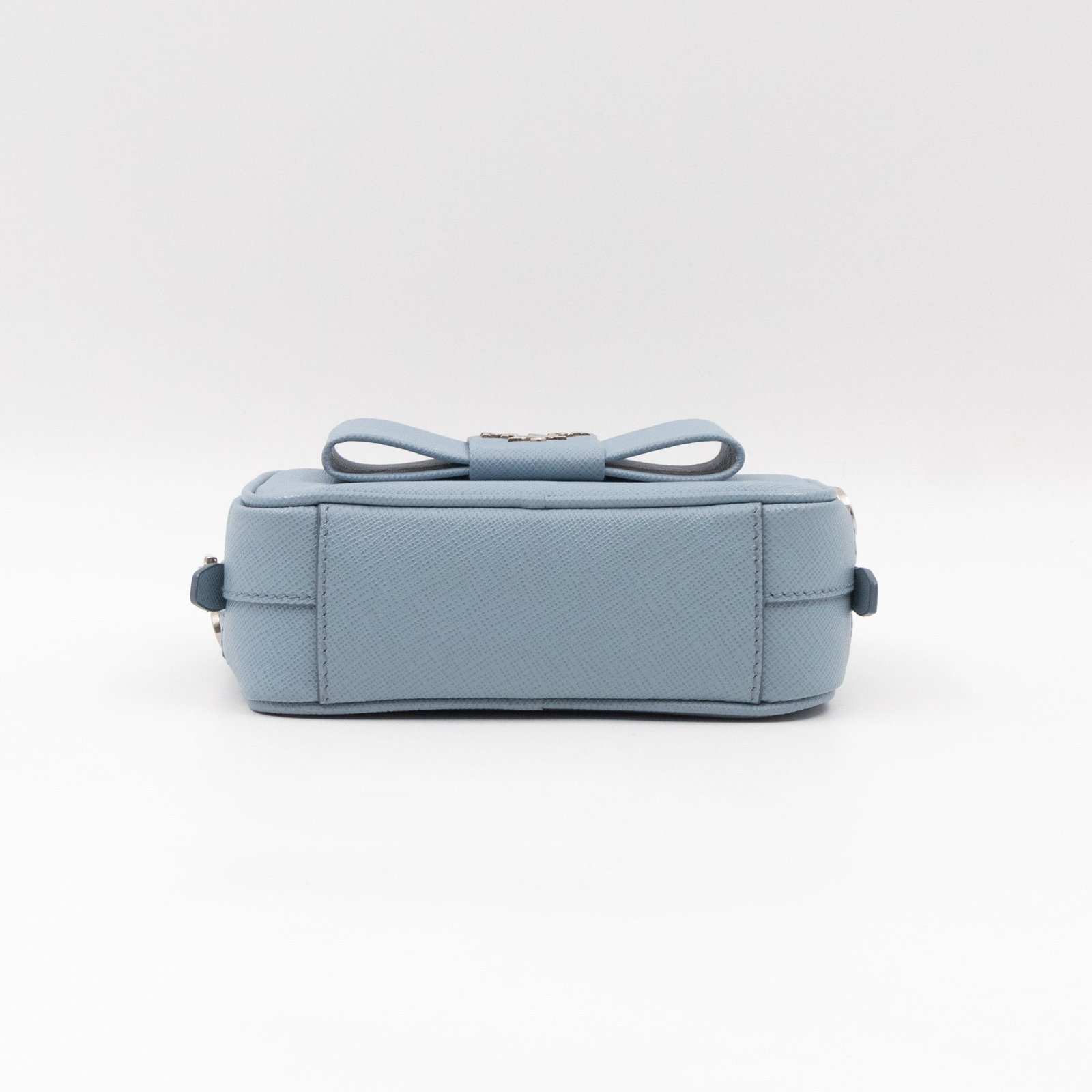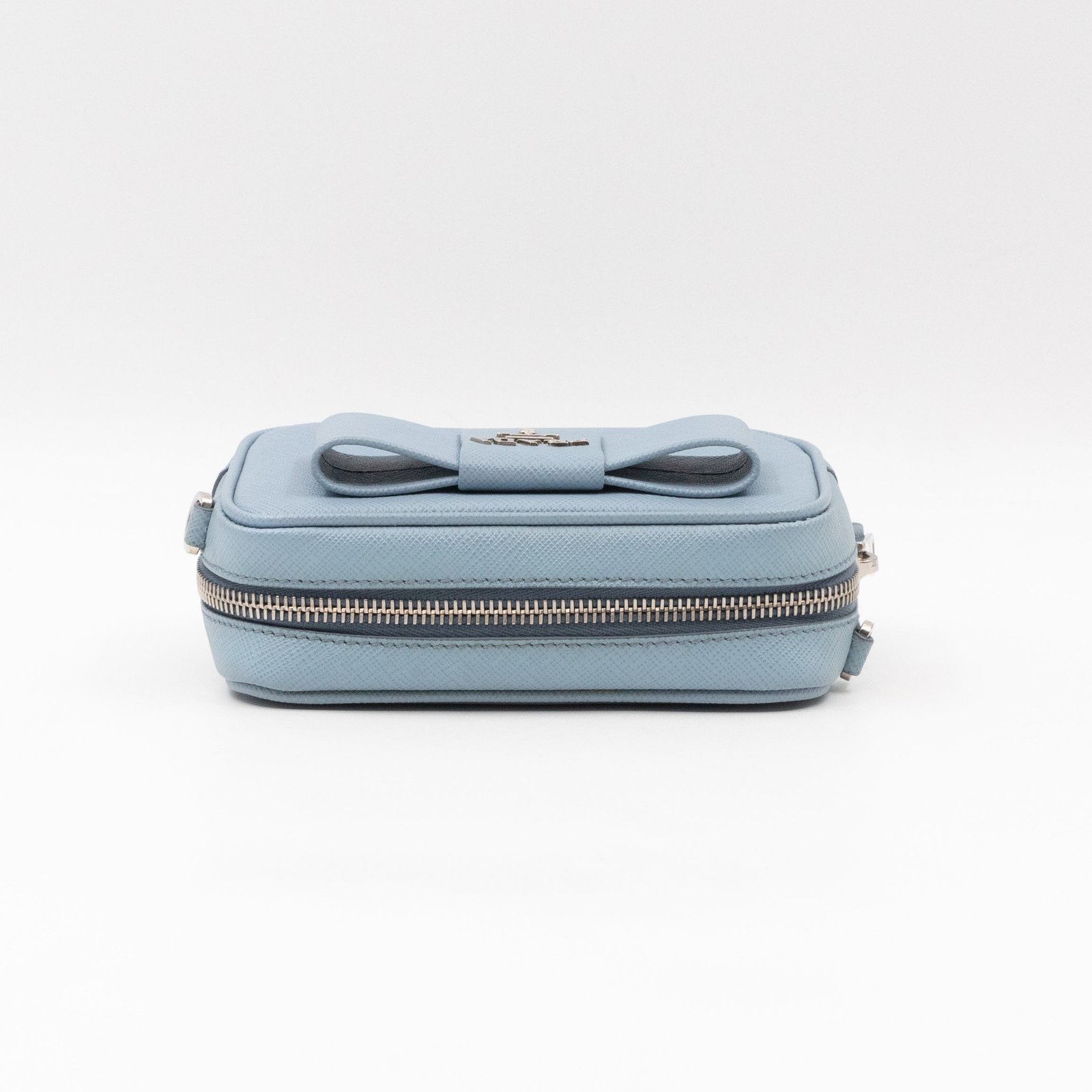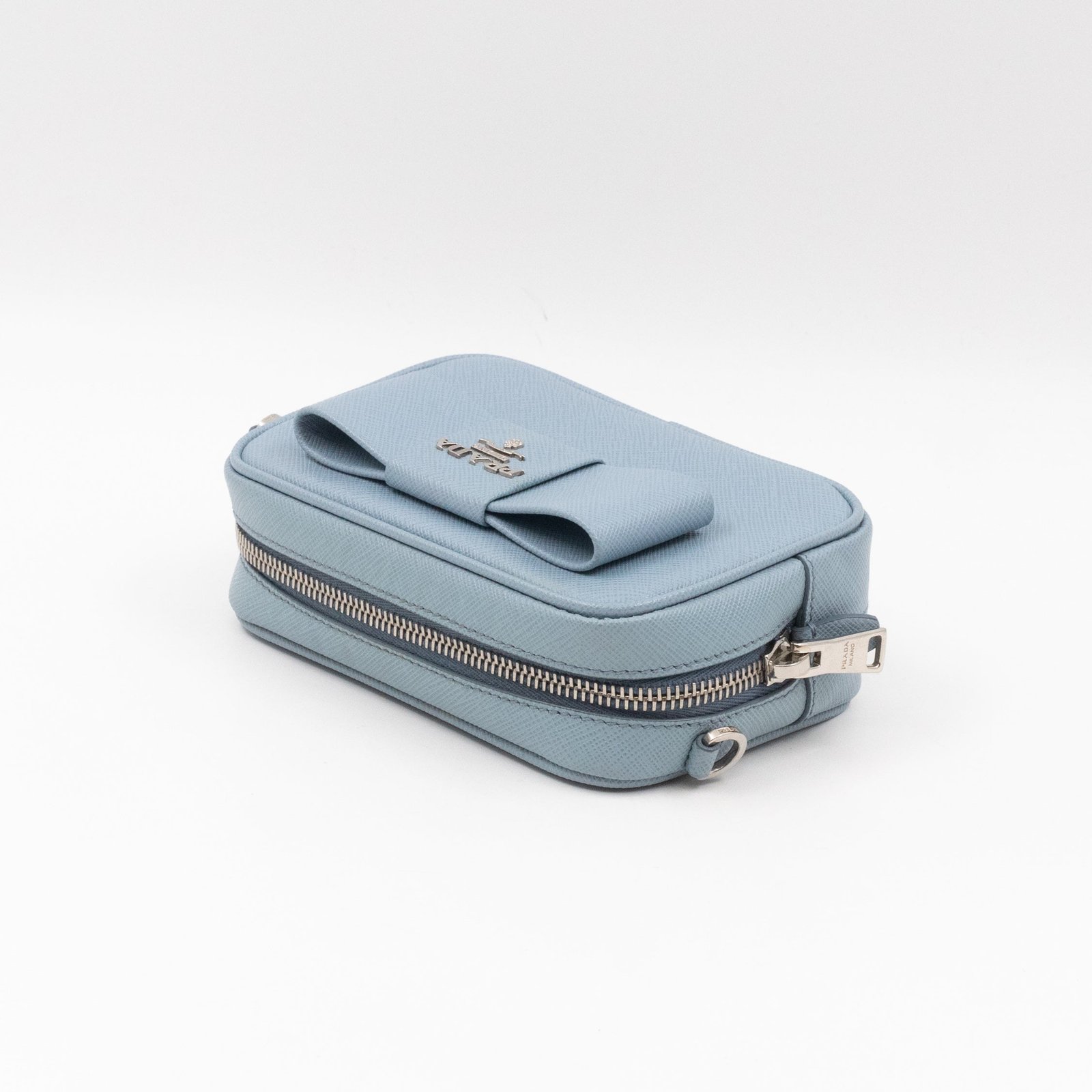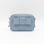 A Prada crossbody camera bag in light blue saffiano leather. This small sized bag has a removable shoulder strap for comfortable crossbody use. Great for daily use for your phone, cards, and keys. Inside has two slim pockets. On front a silver Prada logo on a lovely bow. Inside fits a phone with max length is 14 cm.