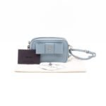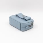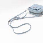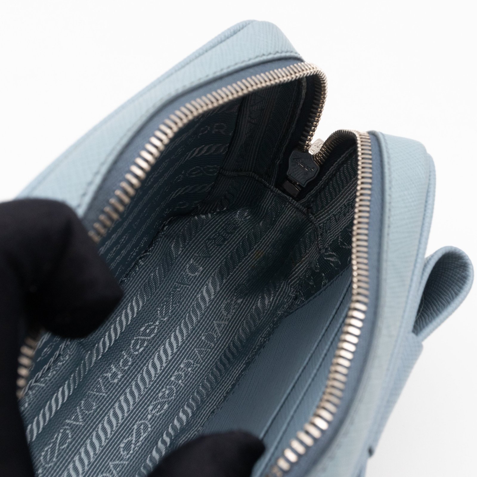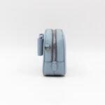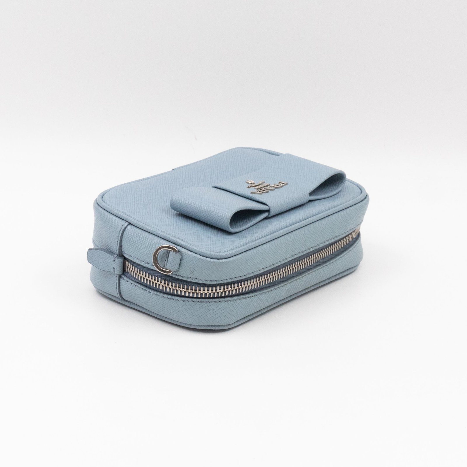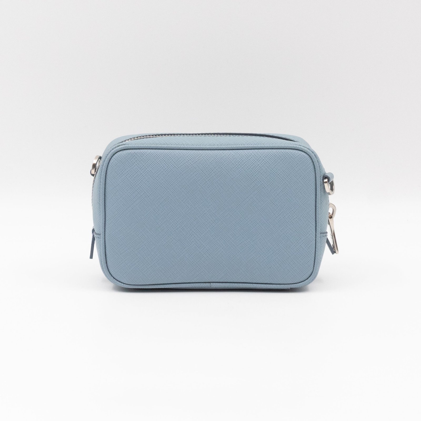 A Prada crossbody camera bag in light blue saffiano leather. This small sized bag has a removable shoulder strap for comfortable crossbody use. Great for daily use for your phone, cards, and keys. Inside has two slim pockets. On front a silver Prada logo on a lovely bow. Inside fits a phone with max length is 14 cm.
