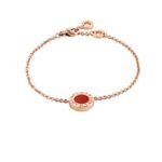 Both sides of the Bvlgari Bvlgari series bracelets are decorated with mother-of-pearl and carnelian roundels, two different elegant styles, and the same beauty. The Bvlgari Bvlgari series injects outstanding charm with cultural atmosphere and modern temperament into the brand’s Roman origins, representing the most distinctive fashion essence of Bvlgari. The double logo logo, which was used for the first time as a brand logo, was inspired by the arc inscriptions on ancient Roman coins and eventually became a classic element in jewelry design. It is still a permanent symbol of Bvlgari’s creativity today. Bvlgari Bvlgari series bracelet, made of 18K rose gold, inlaid with carnelian and mother-of-pearl.