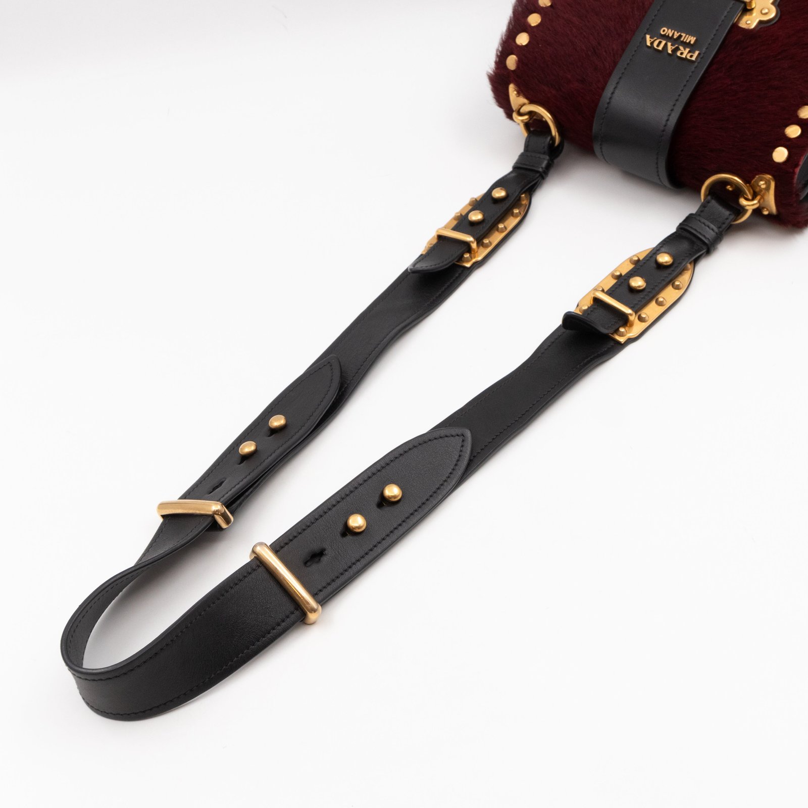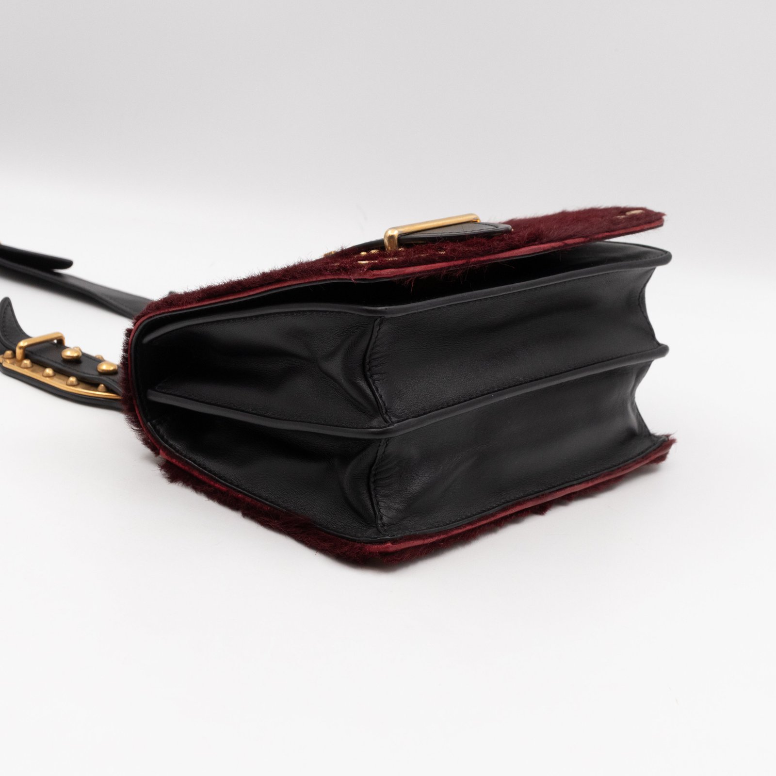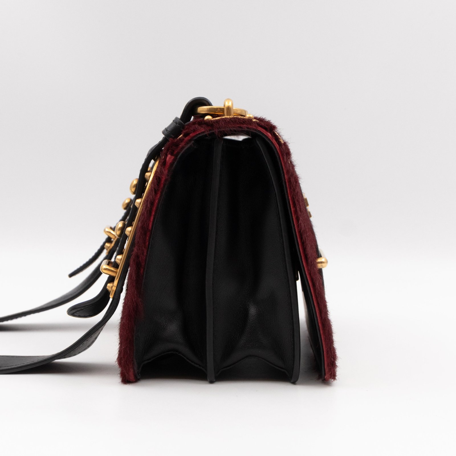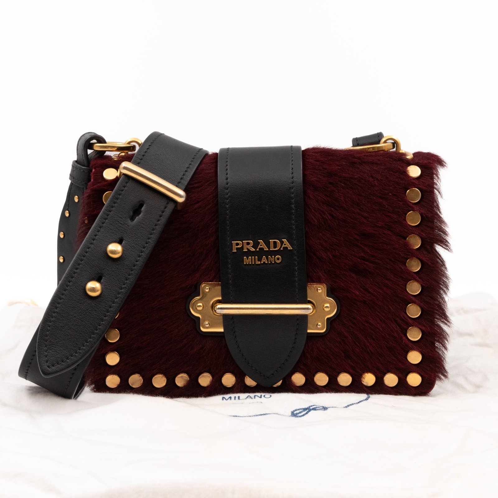 The elegant Cahier bag from Prada is a classic beauty. This stylish crossbody bag is crafted of calf hair in dark red with calfskin leather in black. The bag features an adjustable black leather shoulder strap and aged brass hardware including corner plates and a closure. The crossover flap is covered in burgundy pony hair and opens to a partitioned black leather interior with patch pockets. This excellent shoulder bag is ideal for all of your essentials. Retail price is around €3200.