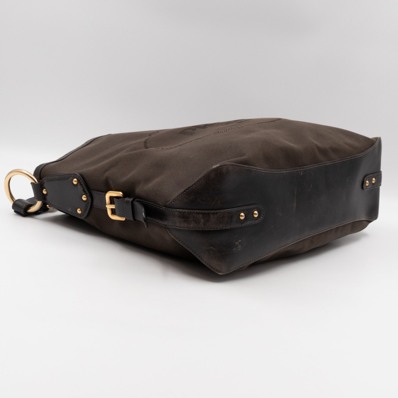 A Prada Canapa Hobo bag in brown canvas. Made in brown canvas and leather with gold-tone hardware. Convenient every day bag, nice size to carry your daily items. Single handle on large rings for comfortable shoulder carrying. Inside is a zipper pocket, the middle has a button closure.