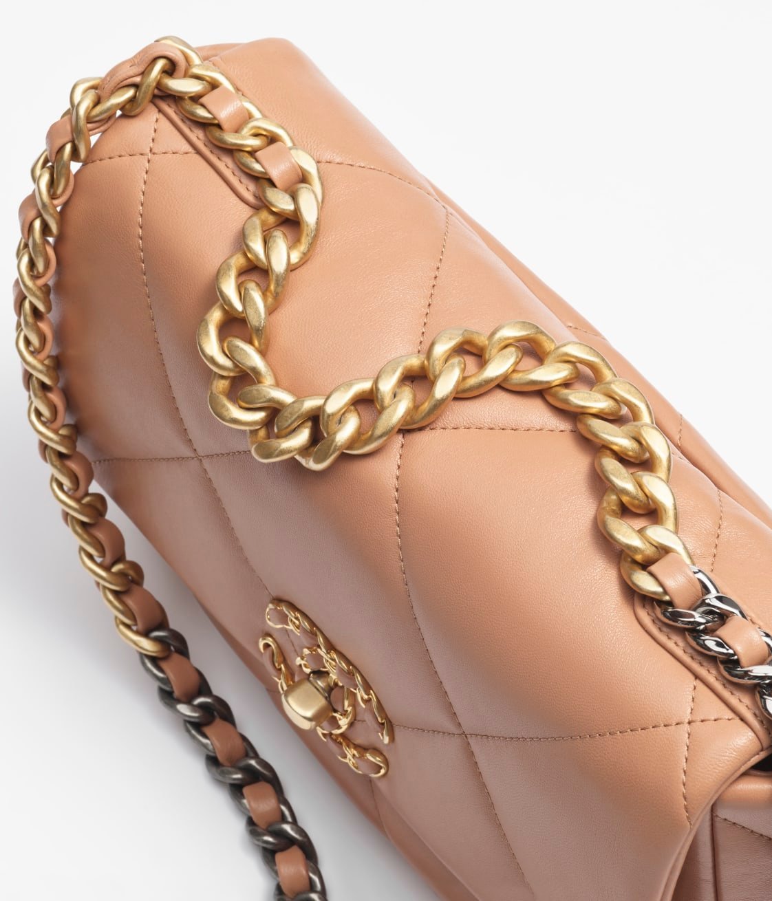 The Medium 19 Flap Bag is crafted from dark beige lambskin with mixed metal hardware and features signature diamond quilting, signature CC interlocking clasp, exterior back pocket, chain top handle and long mixed metal and dark beige leather chain