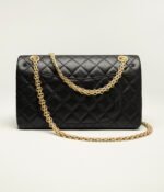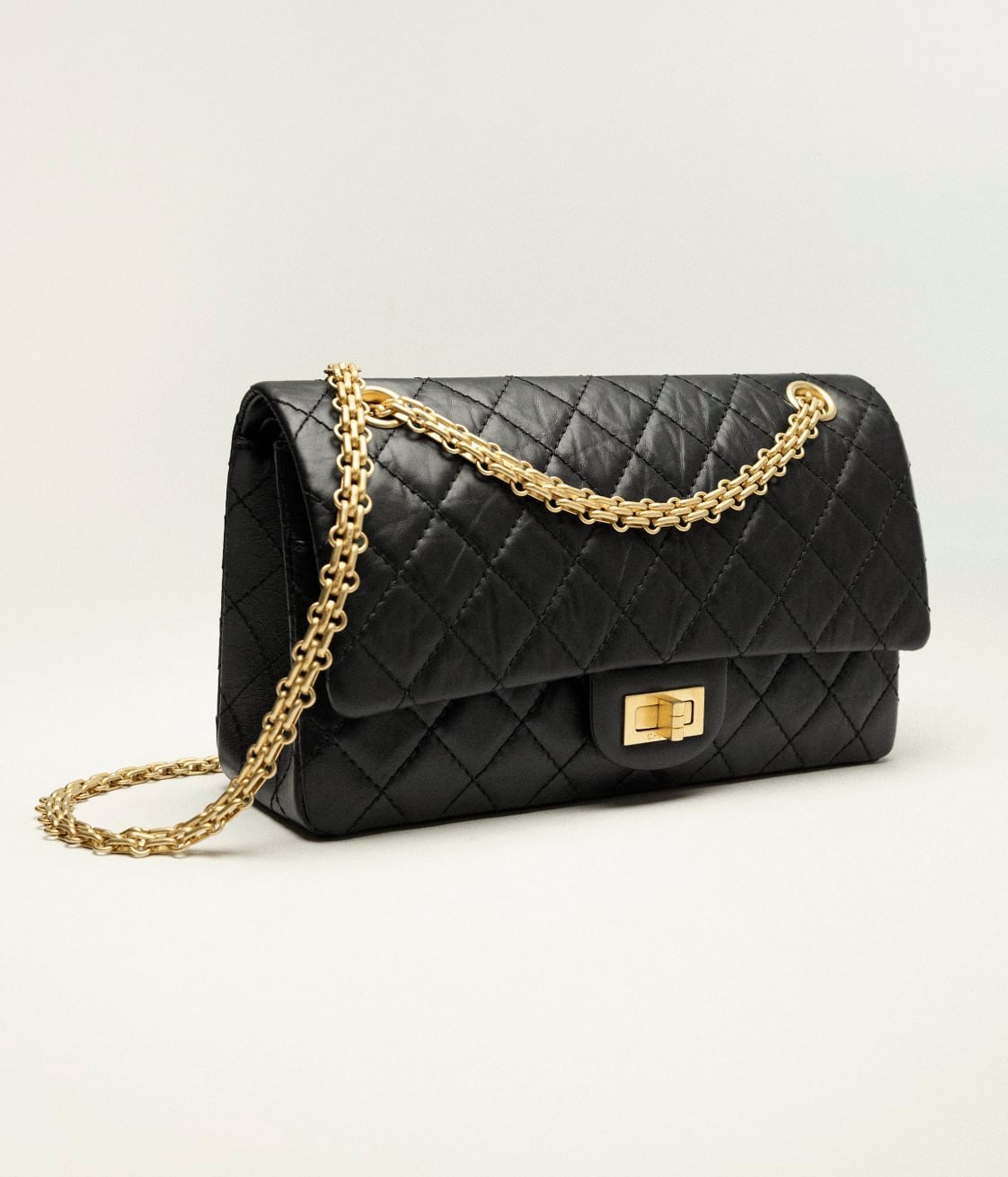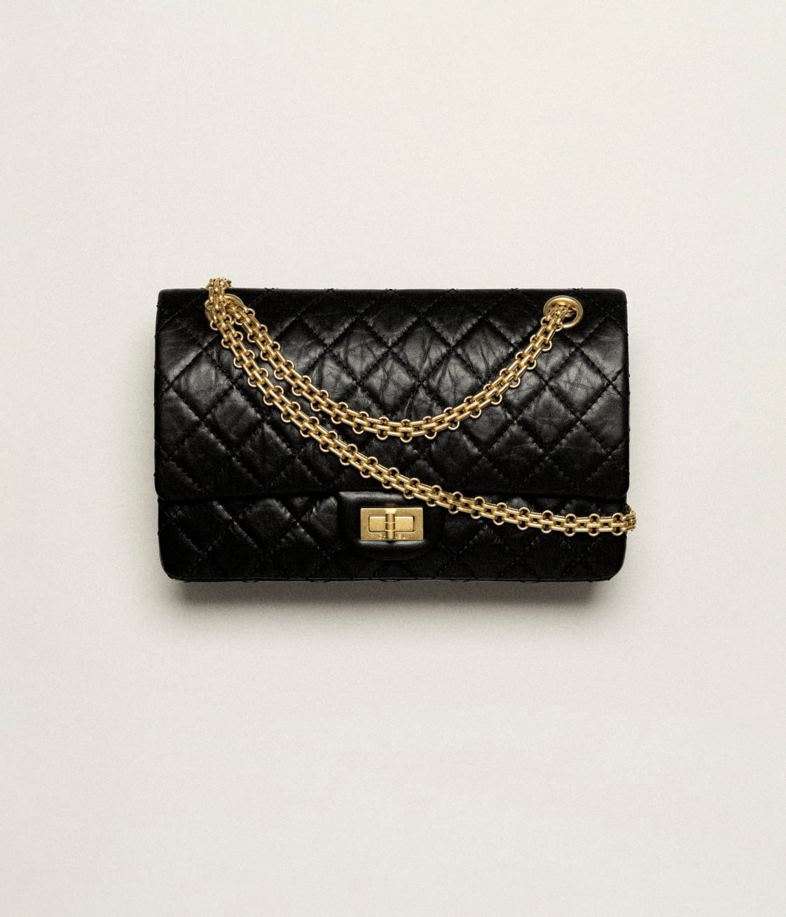 The Reissue 2.55 Single Flap Bag is crafted from distressed black calfskin with antique gold hardware, front flap with Mademoiselle turnlock closure, half-moon back pockets and interwoven gold chain links.