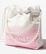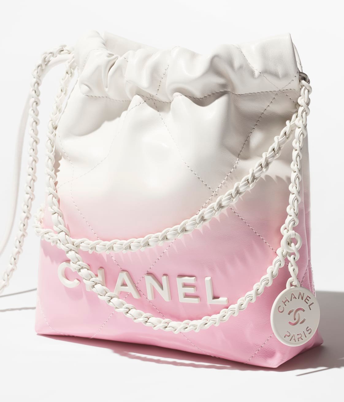 This Chanel Mini 22 Hobo bag is made of white and light pink gradient metallic calfskin with white hardware and signature diamond quilting, white lacquered metal “Chanel” logo on the front, Chanel Paris metal hangtag, white metal and white leather interlaced chain links, long leather cord and long chain link shoulder strap.