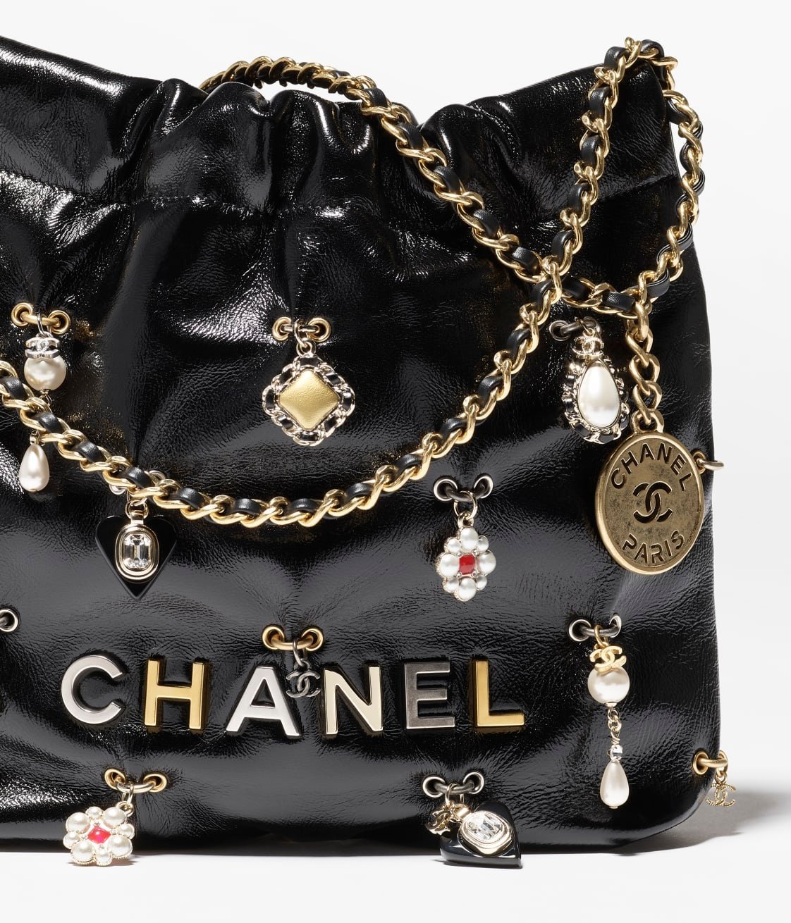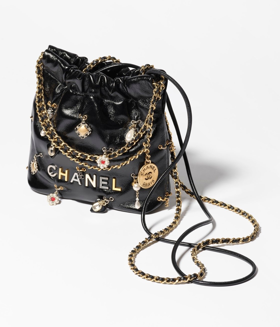 The Mini 22 Hobo is crafted from black calfskin leather with gold-tone hardware, featuring signature diamond quilting, jeweled charms and gold-tone metal ‘Chanel’ signature on the front of the bag, CHANEL Paris metal hangtag, interwoven chain links with gold-tone metal and black leather shoulder straps.