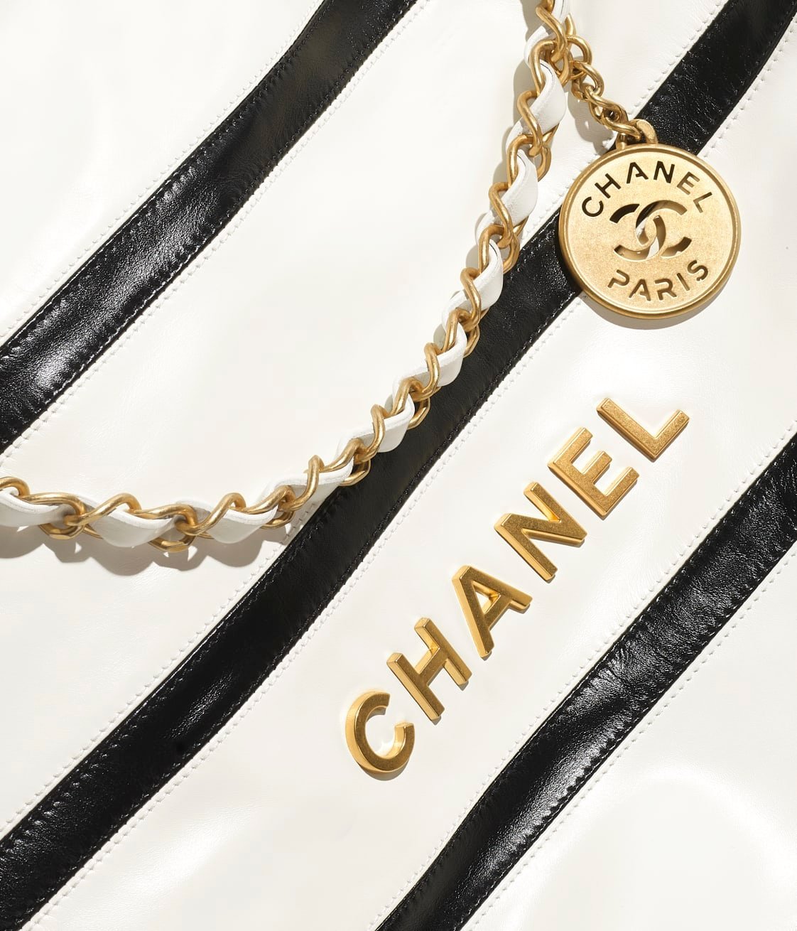 This Small 22 Hobo bag in black and white calfskin with gold-tone hardware, black interior pockets, signature diamond quilting, gold-tone metal CHANEL lettering on the front, and a long gold and white leather chain.