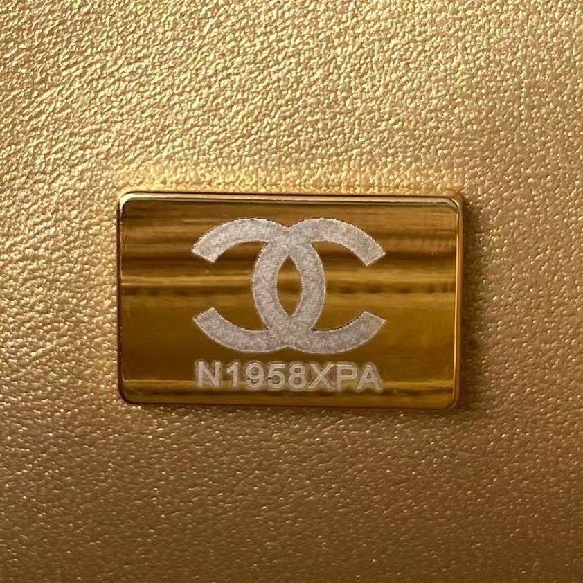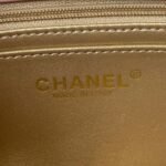 Interior lined with metallic gold leather with zippered pocket with Chanel zipper and open pocket below.