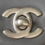 Interior lined in dark grey leather with zippered pocket with Chanel zipper and open pocket underneath.