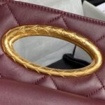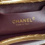 This exquisite Chanel evening bag captivates with its elegant design and luxurious details. The pure black body, reminiscent of a starry night, is both simple and sophisticated. The intricate diamond pattern and iconic gold double-C logo exude understated luxury, while the unique handle adds a touch of charm and playfulness. The classic black and gold combination makes it a perfect accessory for evening events and formal attire.