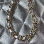 This Chanel Star Bag is crafted from metallic silver lambskin with gold-tone hardware and features a half-moon back pocket, zip top closure and interwoven gold-tone chain link and silver-tone leather shoulder strap.